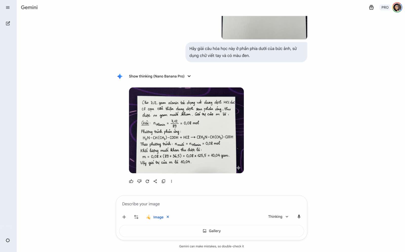 Chuyển sang thử thách thứ hai, mình muốn làm khó Nano Banana Pro trên Gemini 3 Pro hơn một chút với một câu hỏi yêu cầu mô phỏng chữ viết tay trên giấy học sinh. Kịch bản ở đây là mô phỏng trường hợp học sinh chép lại một câu hỏi hóa học ra giấy, sau đó chụp lại và nhờ AI giải đáp.
