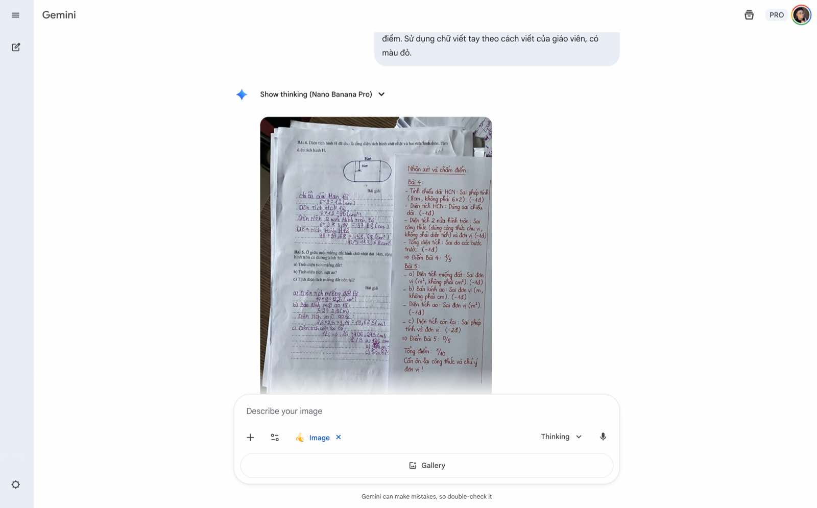 Thử thách cuối cùng và cũng là khó nhất: Mình yêu cầu Gemini đóng vai giáo viên để chấm điểm và nhận xét một bài làm có sẵn. Mình đã chụp ảnh một lời giải toán của học sinh với chữ viết rất xấu, trình bày cẩu thả và sai đáp án để làm đề bài. Yêu cầu của mình là Gemini phải viết nhận xét bằng mực đỏ sang bên phải, chấm điểm chi tiết từng phần theo yêu cầu đưa ra.