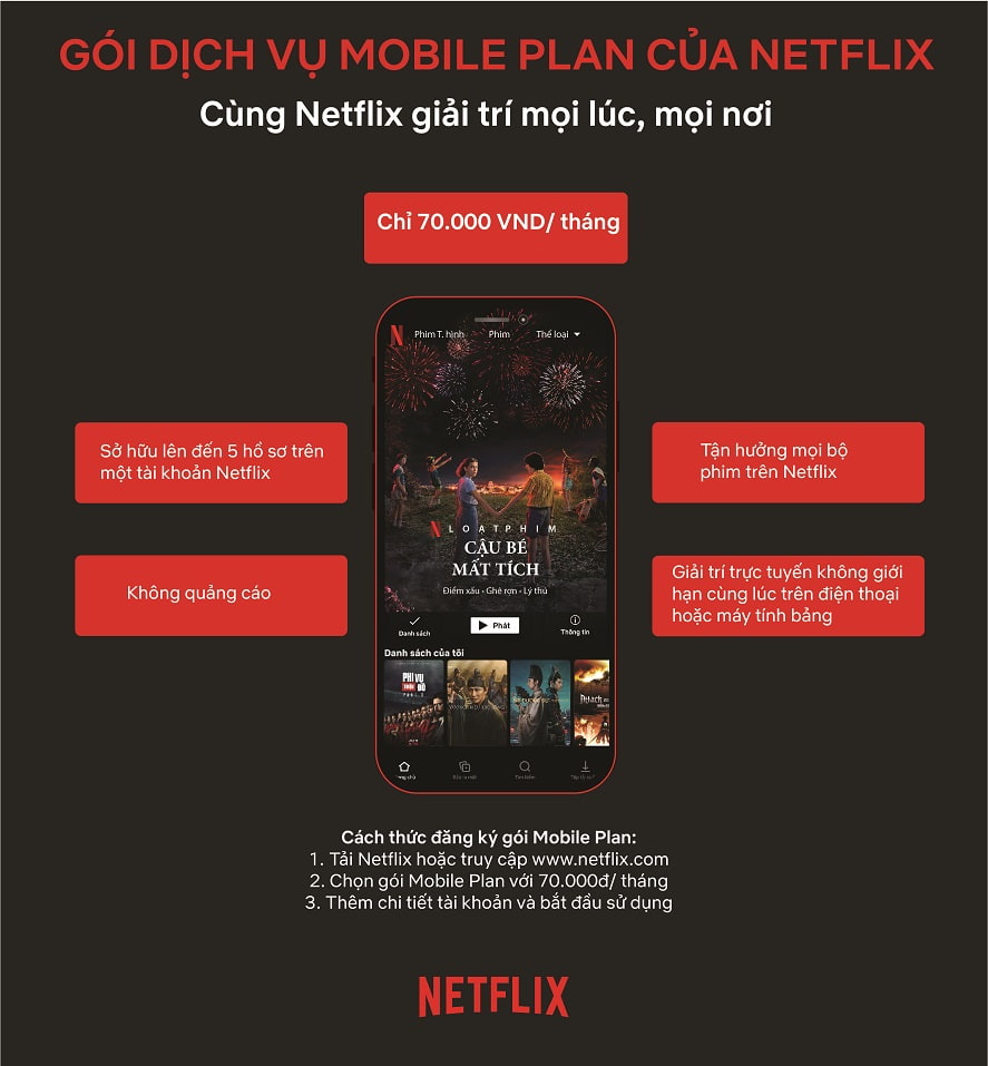 Bắt đầu từ ngày 29 tháng 6, Netflix sẽ giới thiệu gói dịch vụ Mobile Plan tại Việt Nam. Với mức phí 70,000đ/tháng, người dùng có thể thưởng thức toàn bộ nội dung hay mà không bị gián đoạn bởi quảng cáo trên điện thoại, hoặc máy tính bảng. Với sự bổ sung của gói Mobile Plan, người dùng tại Việt Nam giờ đây đã có tổng cộng 4 lựa chọn gói dịch vụ của Netflix, trong đó bao gồm 3 gói hiện có là Cơ Bản (180,000đ/tháng), Tiêu chuẩn (220,000đ/tháng) và Cao cấp (260,000đ/tháng).