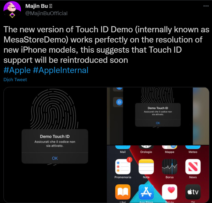 Trong tweet mới của mình, leaker này cho biết đây là một phiên bản thử nghiệm của Touch ID thế hệ mới (Có tên nội bộ là MesaStoreDemo). Nó hoạt động rất tốt trên các mẫu iPhone mới và điều này cũng cho thấy Touch ID có thể sớm được quay lại.