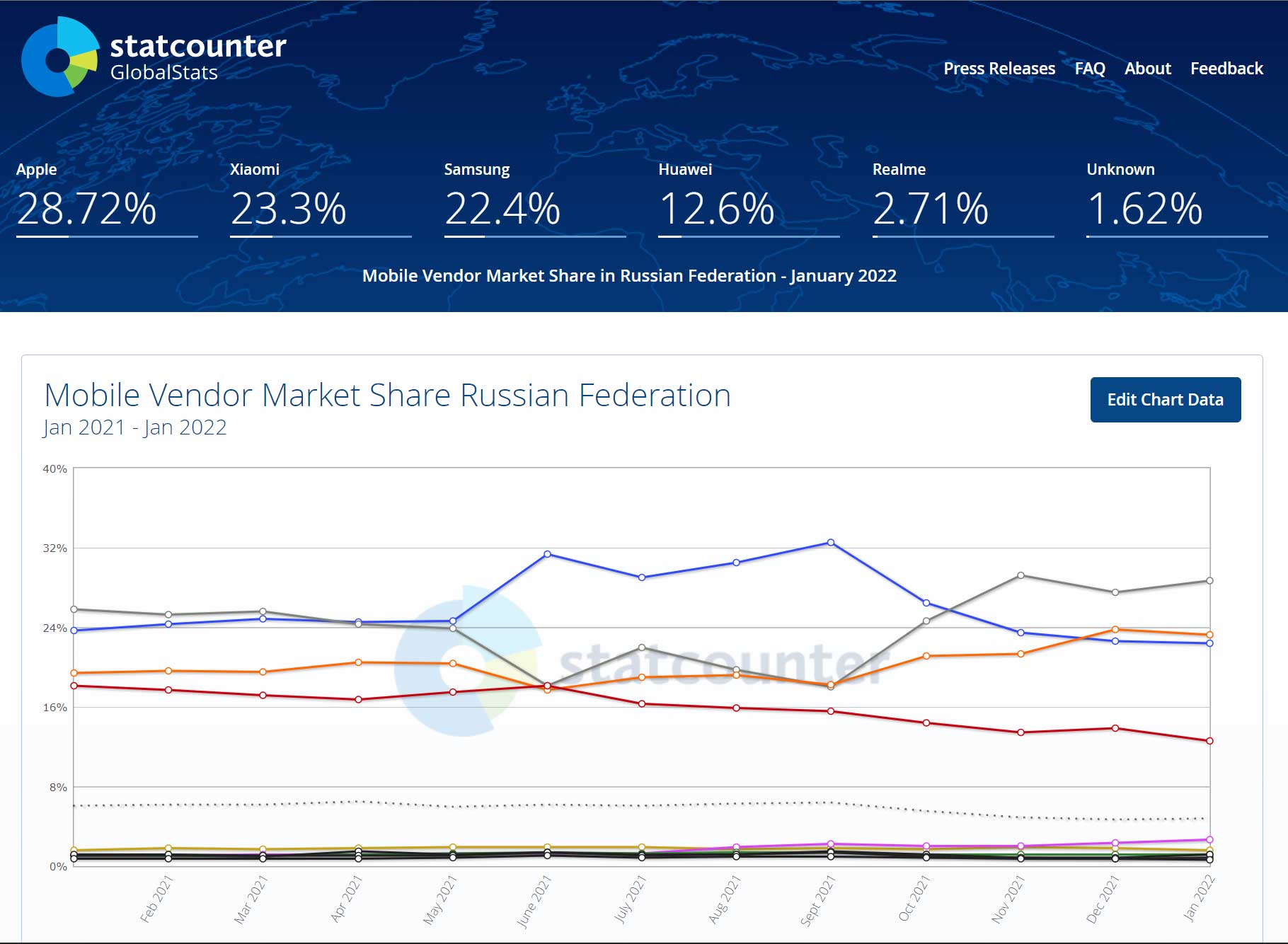 Liên tiếp trong nhiều năm, Apple luôn nằm trong top những thương hiệu điện thoại có thị phần lớn tại Nga. Đối thủ tiềm năng nhất của Apple tại thị trường này chỉ có Samsung. Hai ông lớn này thay phiên nhau dẫn đầu thị phần điện thoại tại Nga. Tổng kết năm 2021 vừa qua, theo số liệu từ Statcounter, Samsung dẫn đầu thị trường Nga với con số 26,61%, Apple xếp thứ hai với con số 23,6%. Samsung đã có một khoảng cách lớn với Apple tại thị trường Nga trong năm vừa qua.