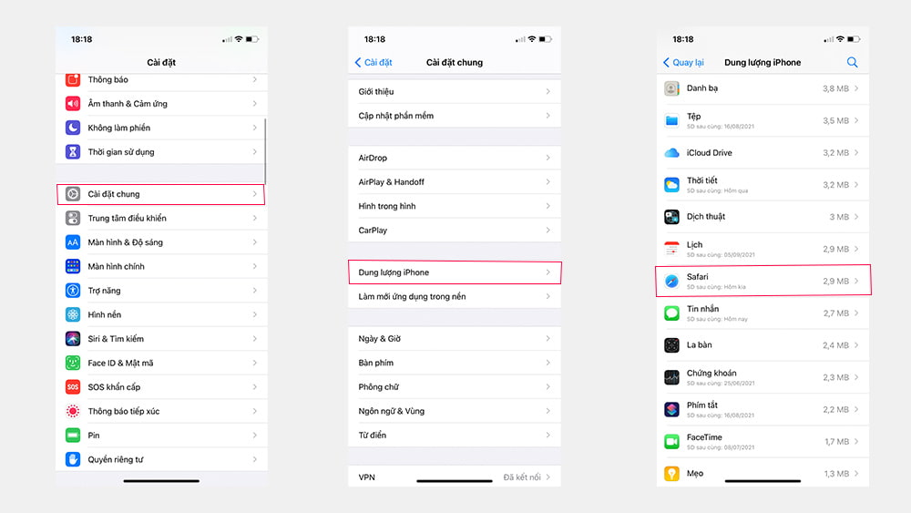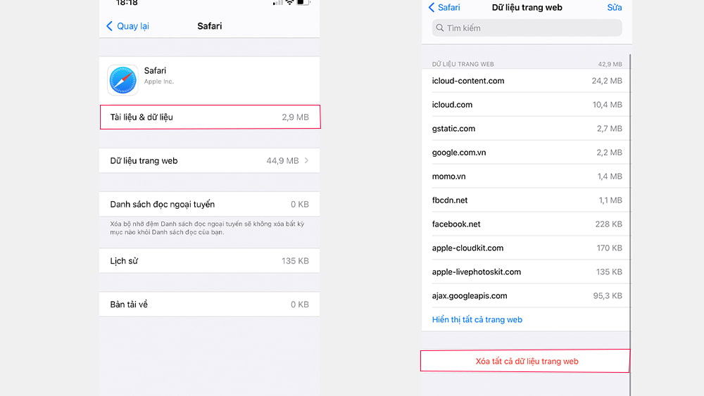 Truy cập vào cài đặt -> Cài đặt chung-> dung lượng iPhone -> Safari-> Xóa lịch sử và dữ liệu trang web