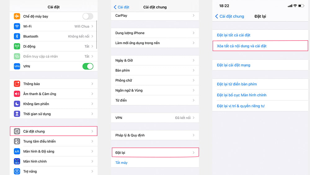 Bạn truy cập vào: Cài đặt -> Cài đặt chung – > đặt lại -> Xóa tất cả nội dung và cài đặt