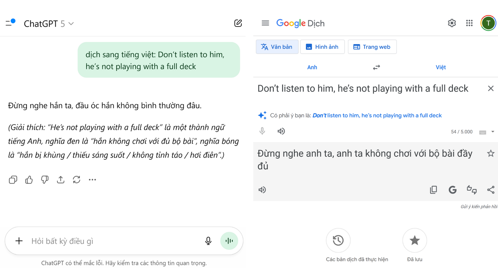 Mặc dù AI thường có ưu thế về chất lượng dịch thuật trong các bối cảnh phức tạp, Google Dịch vẫn có ưu thế rõ rệt ở hai khía cạnh: tốc độ và độ phủ ngôn ngữ. Khi bạn cần một bản dịch nhanh, Google Dịch xử lý gần như tức thời mà không yêu cầu bất kỳ câu lệnh bổ sung nào như khi sử dụng AI. Chỉ cần sao chép, dán và xem kết quả.