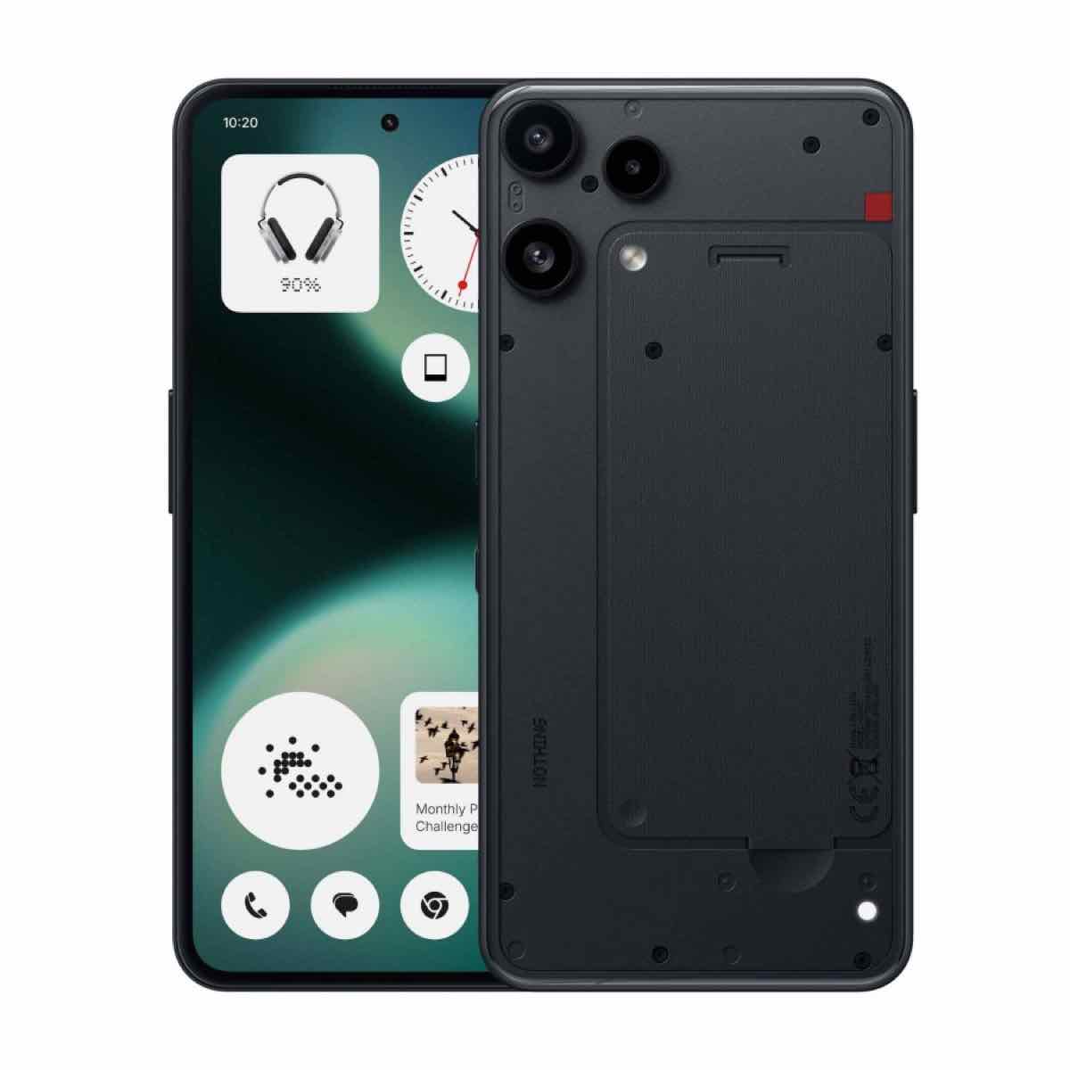 Dù vậy, máy vẫn giữ ADN thiết kế của Nothing với mặt lưng kính trong suốt, để lộ các linh kiện bên trong được sắp xếp theo phong cách công nghiệp. Thiết bị có khung viền kim loại, đạt chuẩn kháng nước và bụi IP54, và được bảo vệ bằng kính Panda Glass.