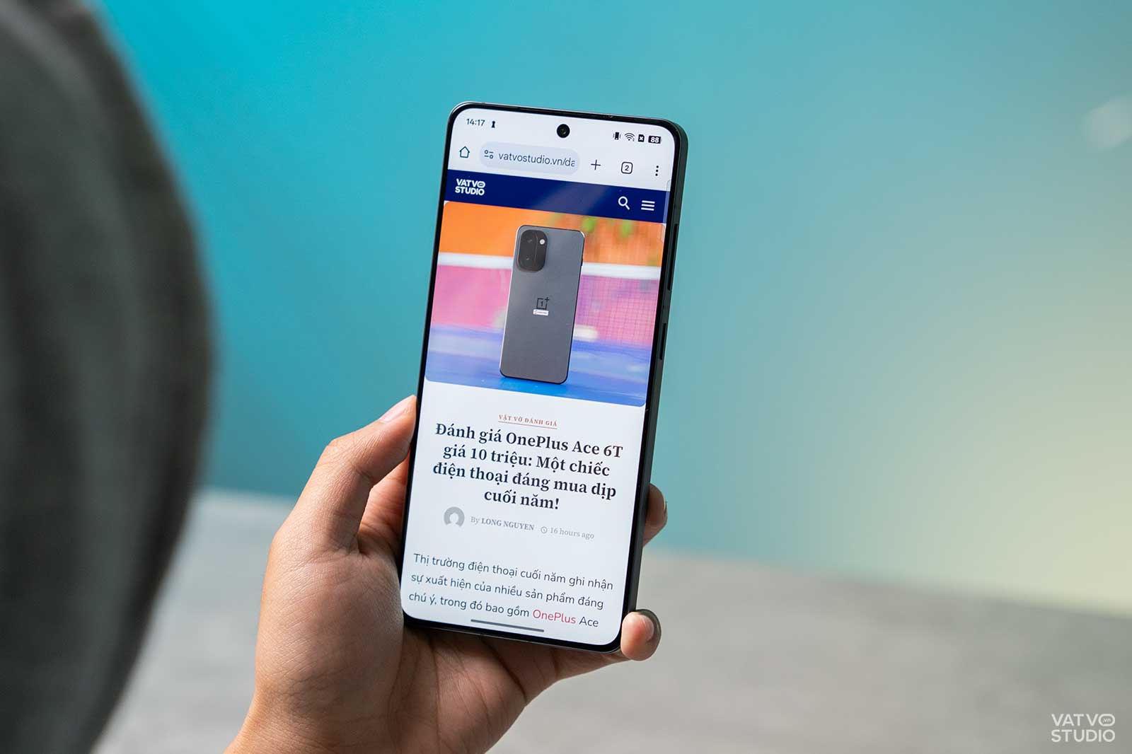 Đặc biệt, phần viền màn hình của OnePlus Ace 5 được làm cực kỳ mỏng. Thậm chí, mình có cảm giác viền của chiếc máy này còn mỏng hơn cả thế hệ kế nhiệm là OnePlus Ace 6. Sự tối ưu về viền màn hình kết hợp với tần số quét 120Hz mượt mà mang lại trải nghiệm thị giác vô cùng đã mắt, dù là lướt web hay xem phim.