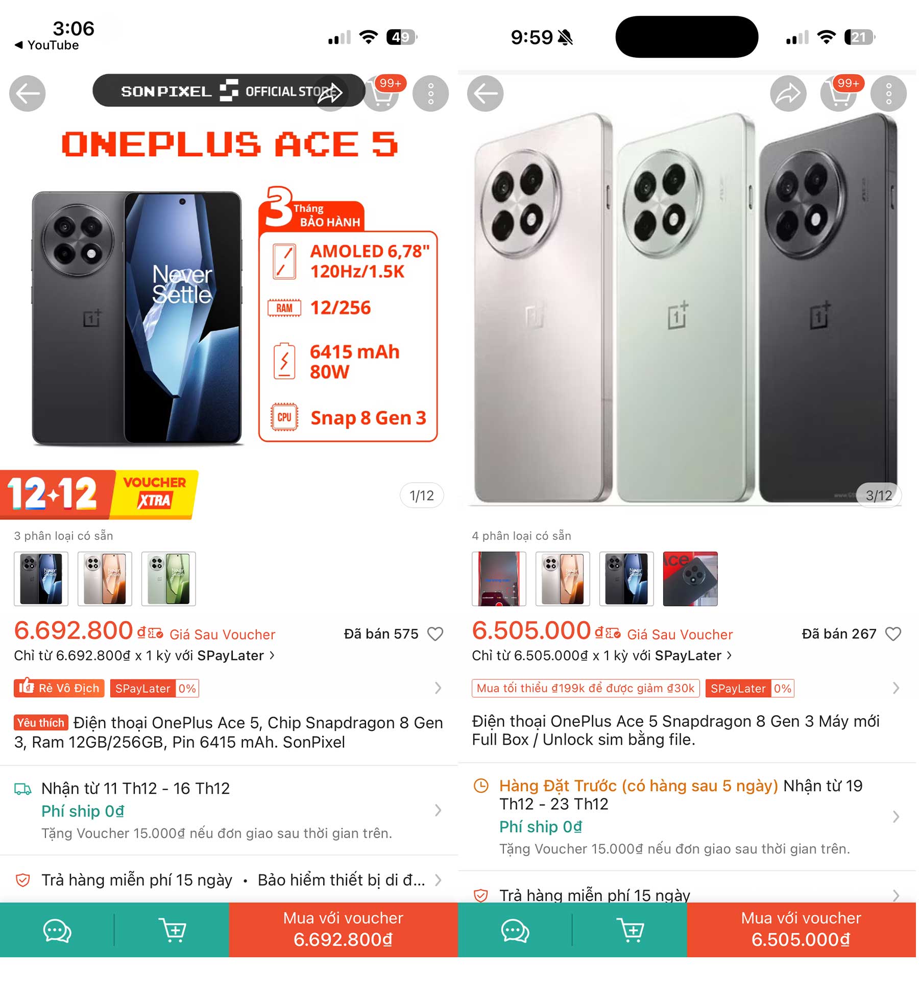 Tuy nhiên, người dùng hoàn toàn có thể sở hữu thiết bị này với mức giá rẻ hơn rất nhiều thông qua các sàn thương mại điện tử. Cụ thể, nếu mua trên Shopee và áp dụng các mã giảm giá từ chương trình YouTube Shopping hay các đợt sale lớn, mức giá của OnePlus Ace 5 có thể giảm xuống chỉ còn khoảng 6,5 triệu đồng.