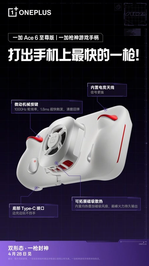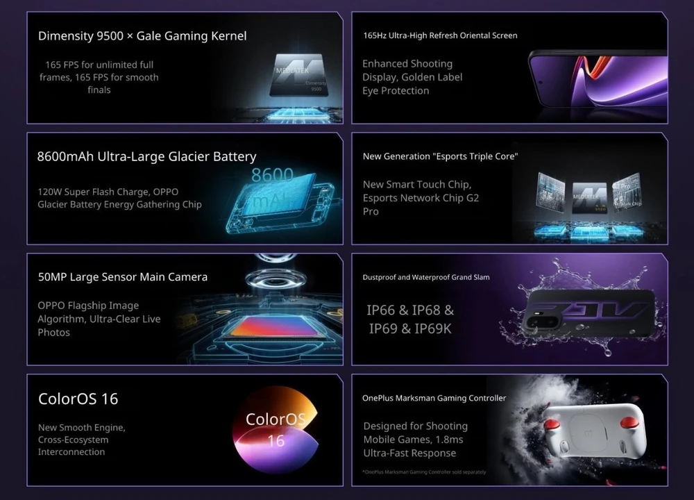 Song song với việc giới thiệu điện thoại, hãng cũng mang tới một tay cầm chơi game được thiết kế riêng cho dòng máy này mang tên OnePlus Marksman Gaming Controller. Phụ kiện này được tích hợp bốn nút vật lý ở mặt sau và người dùng sẽ thao tác hoàn toàn trên màn hình điện thoại ở mặt trước. Thiết kế này giúp game thủ thực hiện nhanh các thao tác ngắm bắn và di chuyển trong những trò chơi bắn súng FPS phổ biến.