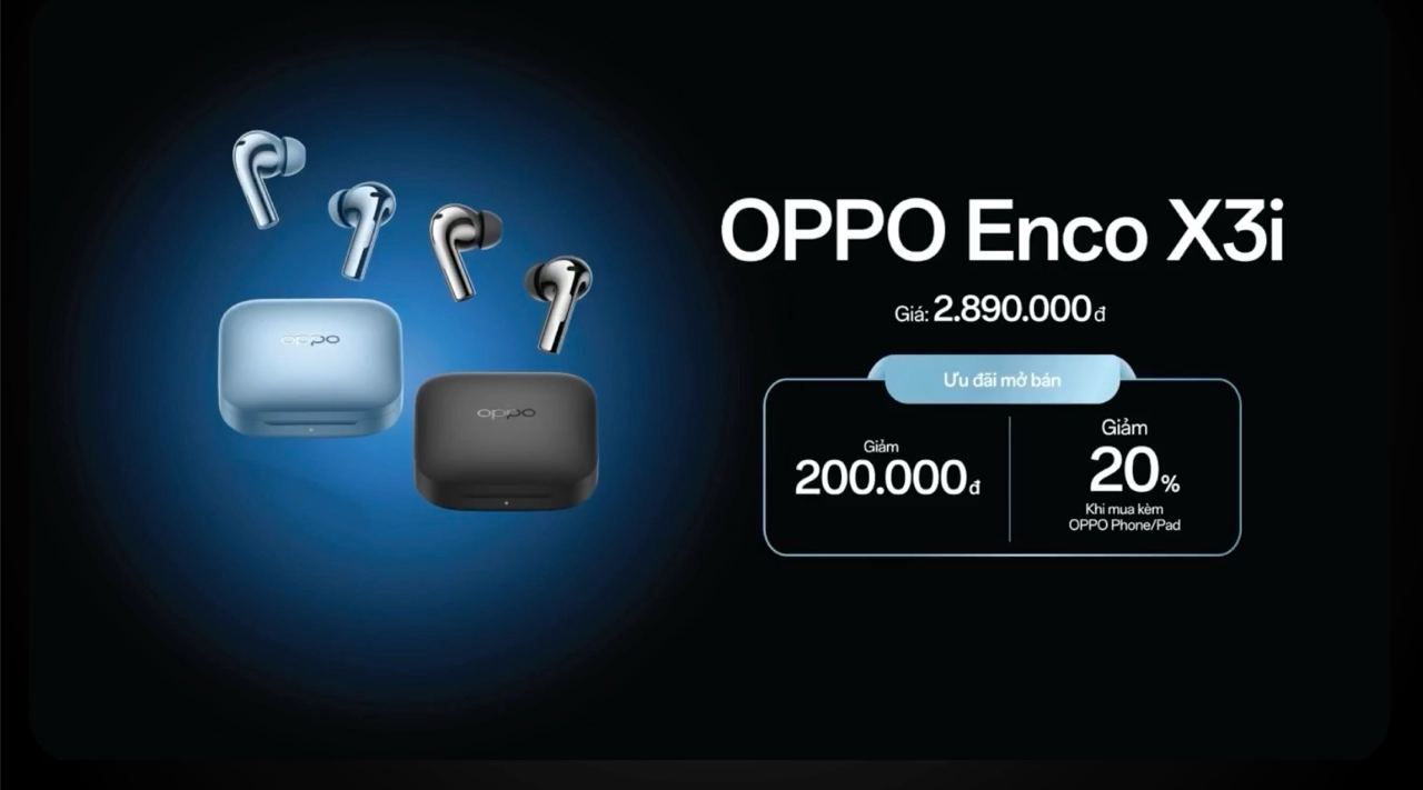 Bên cạnh dòng flagship cao cấp Find X8 series, OPPO cũng đã trình làng tai nghe không dây (TWS) OPPO Enco X3i tại thị trường quốc tế. Sản phẩm sở hữu ngoại hình nhỏ gọn, khả năng chống ồn chủ động 49 dB cùng thời lượng pin lên đến 44 giờ liên tục. Tại Việt Nam, sản phẩm có giá bán chính thức 2.890.000 đồng, đi kèm loạt ưu đãi hấp dẫn.