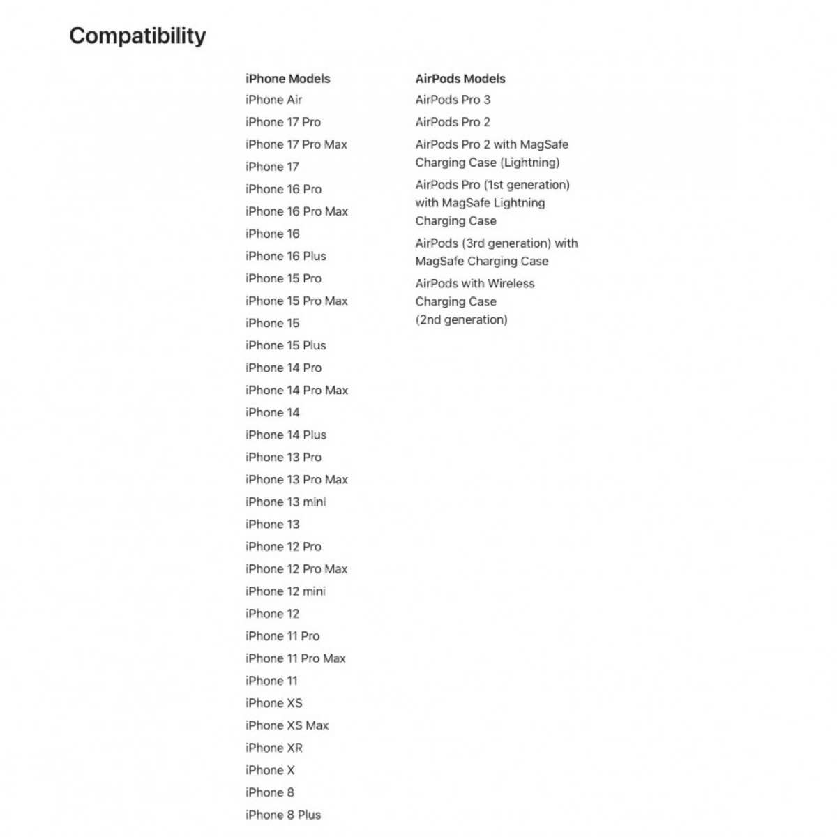 Sản phẩm có hai phiên bản là dây đeo ngắn và dây đeo dài, tương thích với tất cả các dòng iPhone từ iPhone 8 trở lên và tất cả các mẫu AirPods.