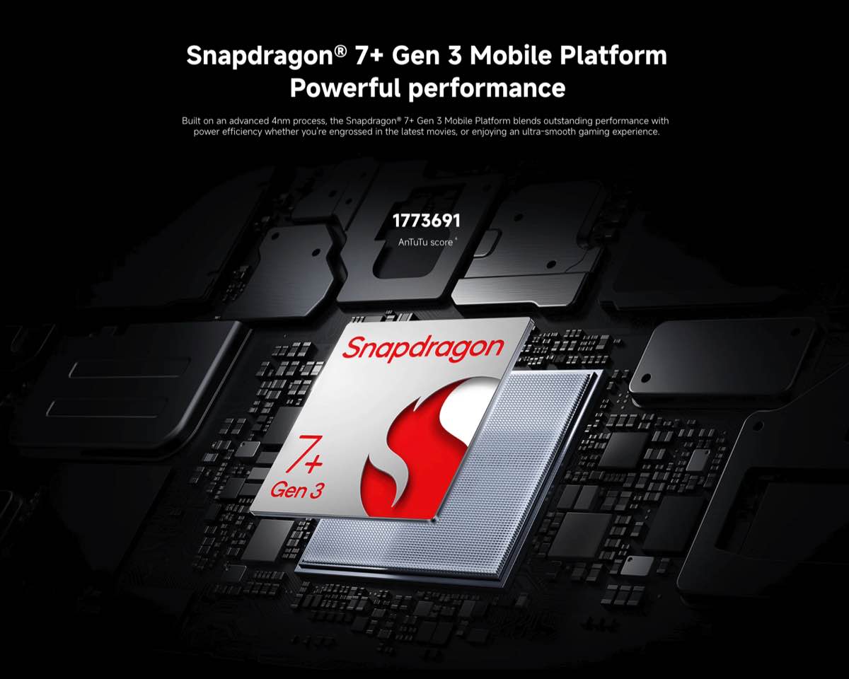 Ẩn dưới lớp vỏ nhôm nguyên khối siêu mỏng 6,18mm là sức mạnh của vi xử lý Snapdragon 7+ Gen 3. Đây là con chip được đánh giá rất cao về sự cân bằng giữa hiệu năng và nhiệt độ.
