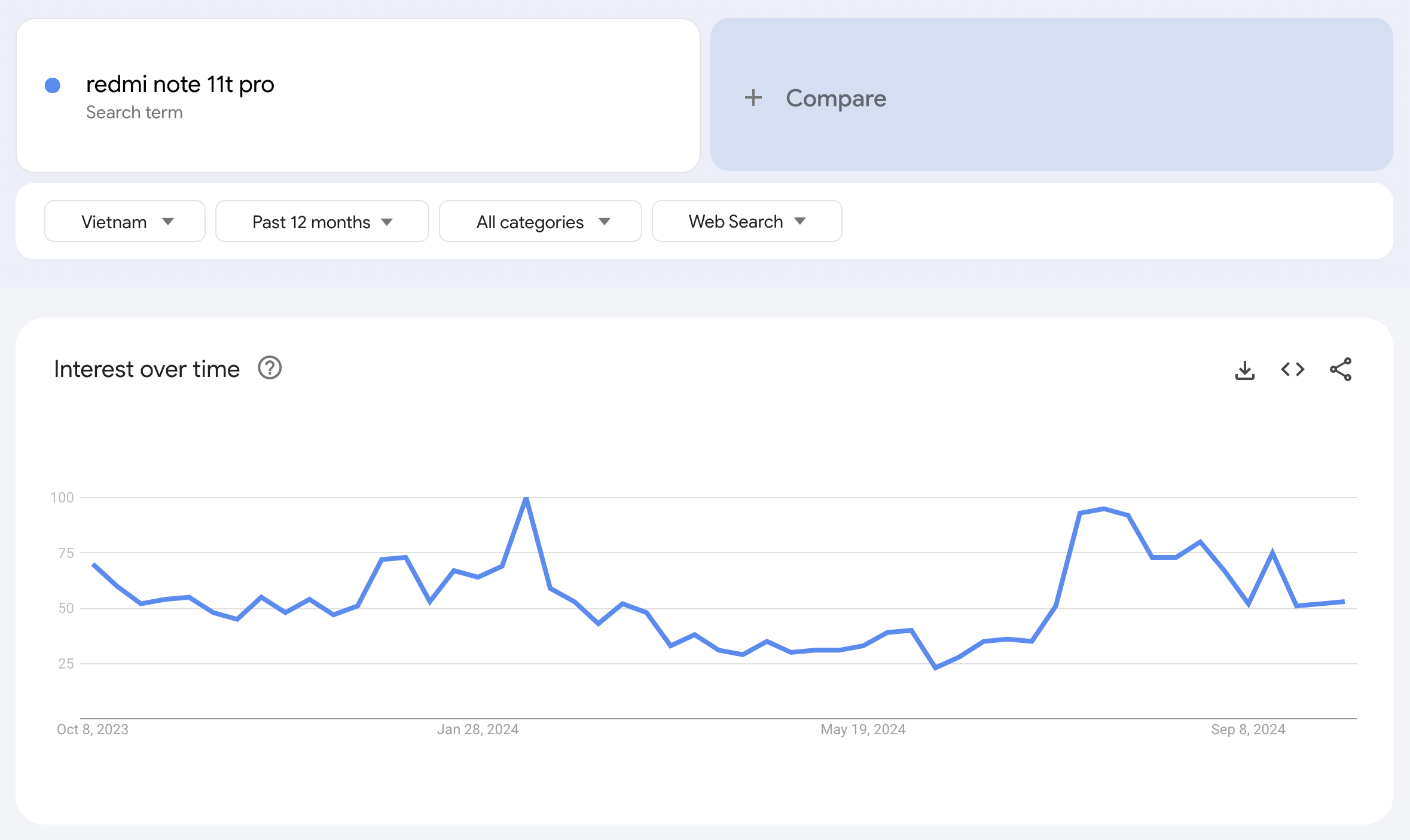 Minh chứng, theo dữ liệu từ Google Trends, lượng tìm kiếm về Redmi Note 11T Pro kể từ tháng 7 – 10/2024 đã tăng lên nếu so với thời điểm 3 tháng trước đó. Nếu tìm kiếm trên các hội nhóm Facebook, người dùng có thể dễ dàng bắt gặp các bài rao bán về sản phẩm này. Thậm chí, trên Shopee, số lượng người bán Redmi Note 11T Pro còn lớn hơn cả phiên bản kế nhiệm Redmi Note 12T Pro.