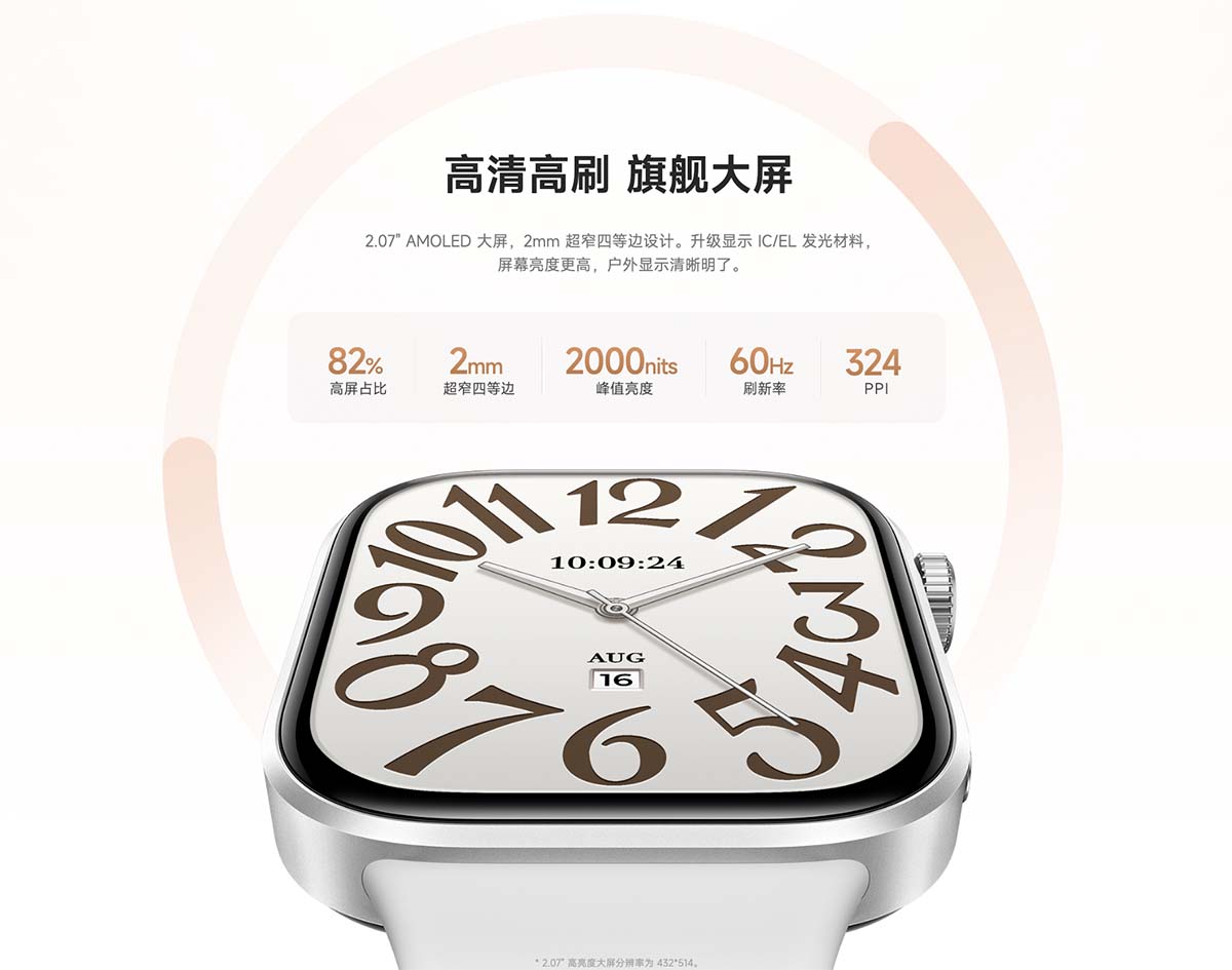 REDMI Watch 6 sở hữu màn hình AMOLED lớn tới 2,07 inch, độ phân giải 432 × 514 pixel, độ sáng tối đa lên đến 2.000 nit và tần số quét 60Hz. Màn hình này có viền siêu mỏng chỉ 2mm ở tất cả các cạnh, mang lại tỷ lệ màn hình trên thân máy đạt 82% và được bảo vệ bởi lớp kính cong 2.5D sang trọng. Đồng hồ cũng hỗ trợ tính năng Màn hình Luôn Bật (AOD) đủ màu ở tần số 5Hz, giúp người dùng dễ dàng xem giờ và thông báo mà không cần bật sáng toàn bộ màn hình.
