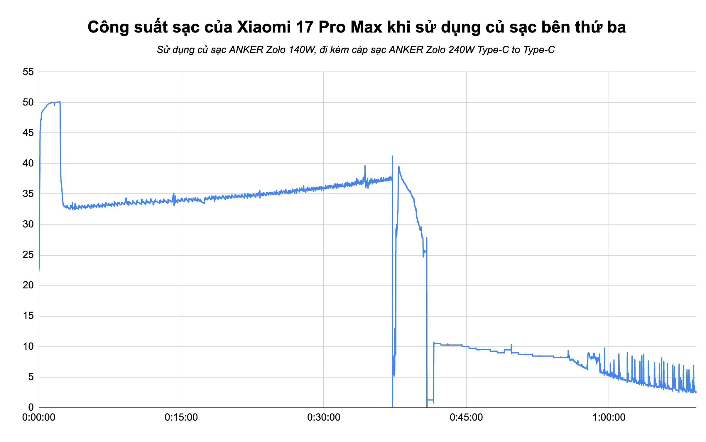 Trong thử nghiệm này, mình cũng có đo công suất sạc trên Xiaomi 17 Pro Max theo thời gian thực. Như biểu đồ bên dưới, có thể thấy khi mới cắm sạc, máy sẽ đẩy công suất sạc lên khá cao, đạt khoảng 50W trong 2 – 3 phút đầu tiên. Ngay sau đó, công suất bị hạ xuống, dao đông trong khoảng 30 – 40W. Tuy nhiên, một điều khá thú vị là trong khoảng 30 phút đầu tiên, công suất sạc lại tăng lên theo thời gian, khác với quy luật thông thường là phải hạ xuống dần dần.
