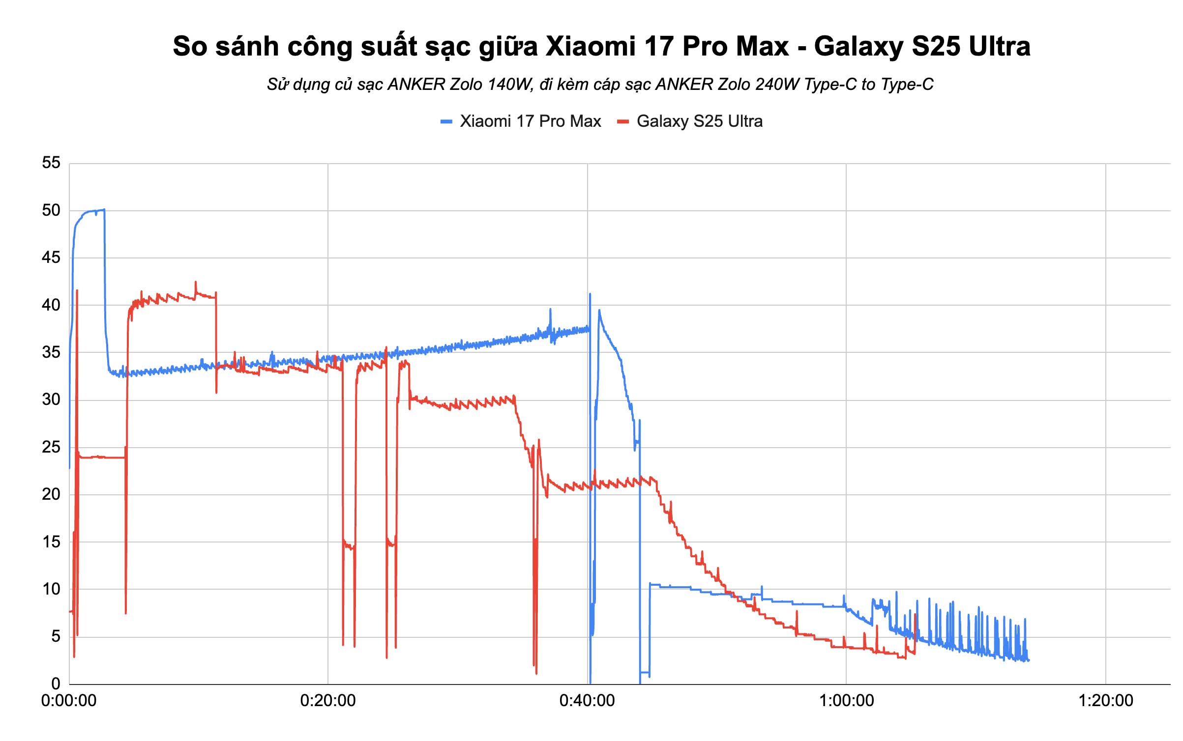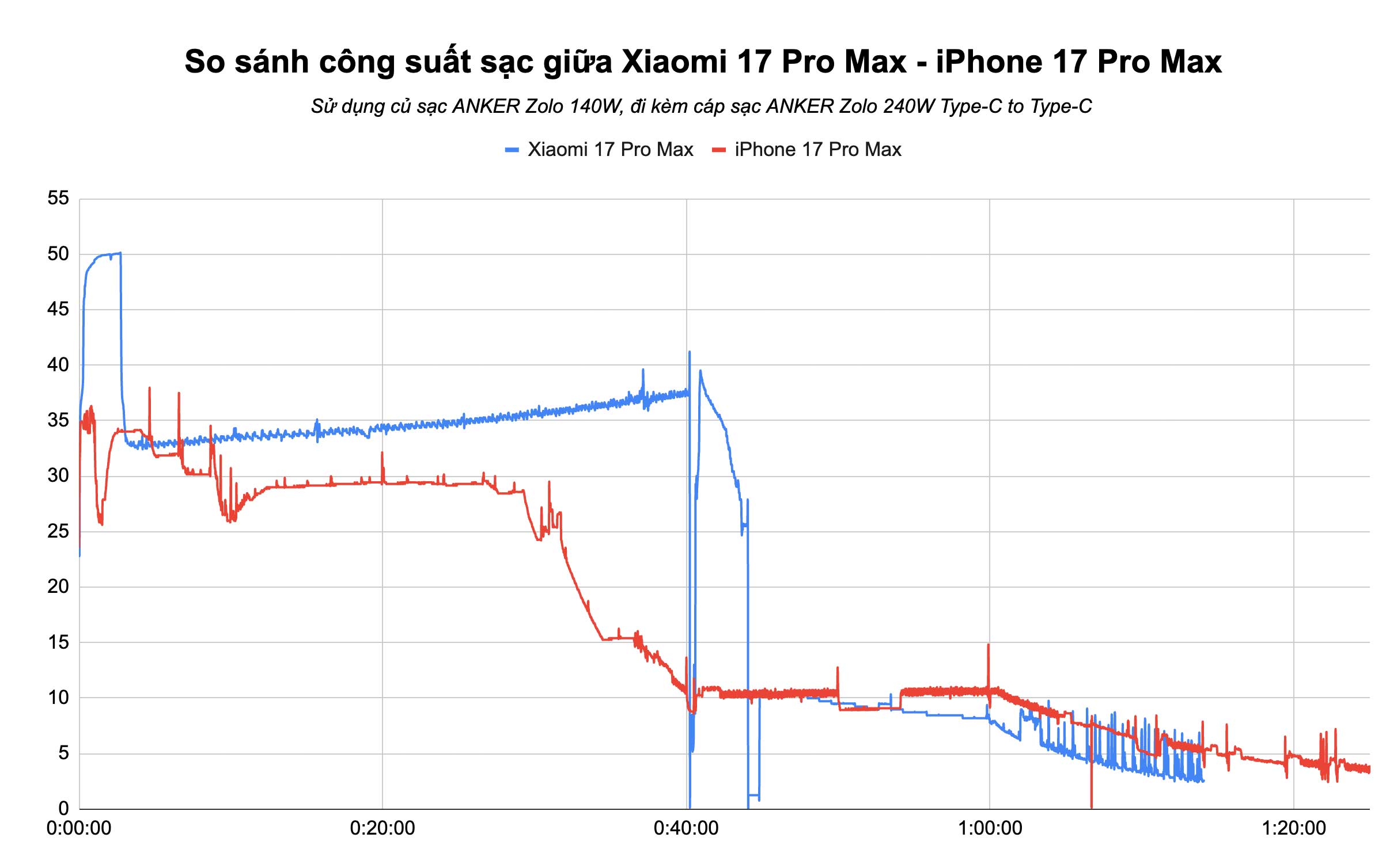 Khi so sánh với iPhone 17 Pro Max với cùng củ sạc ANKER Zolo, có thể thấy công suất đỉnh khi sạc Xiaomi 17 Pro Max cao hơn đáng kể (50W so với chỉ khoảng 35 – 36W trên iPhone). Công suất trung bình trong khoảng 40 phút đầu tiên của máy cũng cao hơn so với iPhone (khoảng 35,5W so với 26,7W trên iPhone).