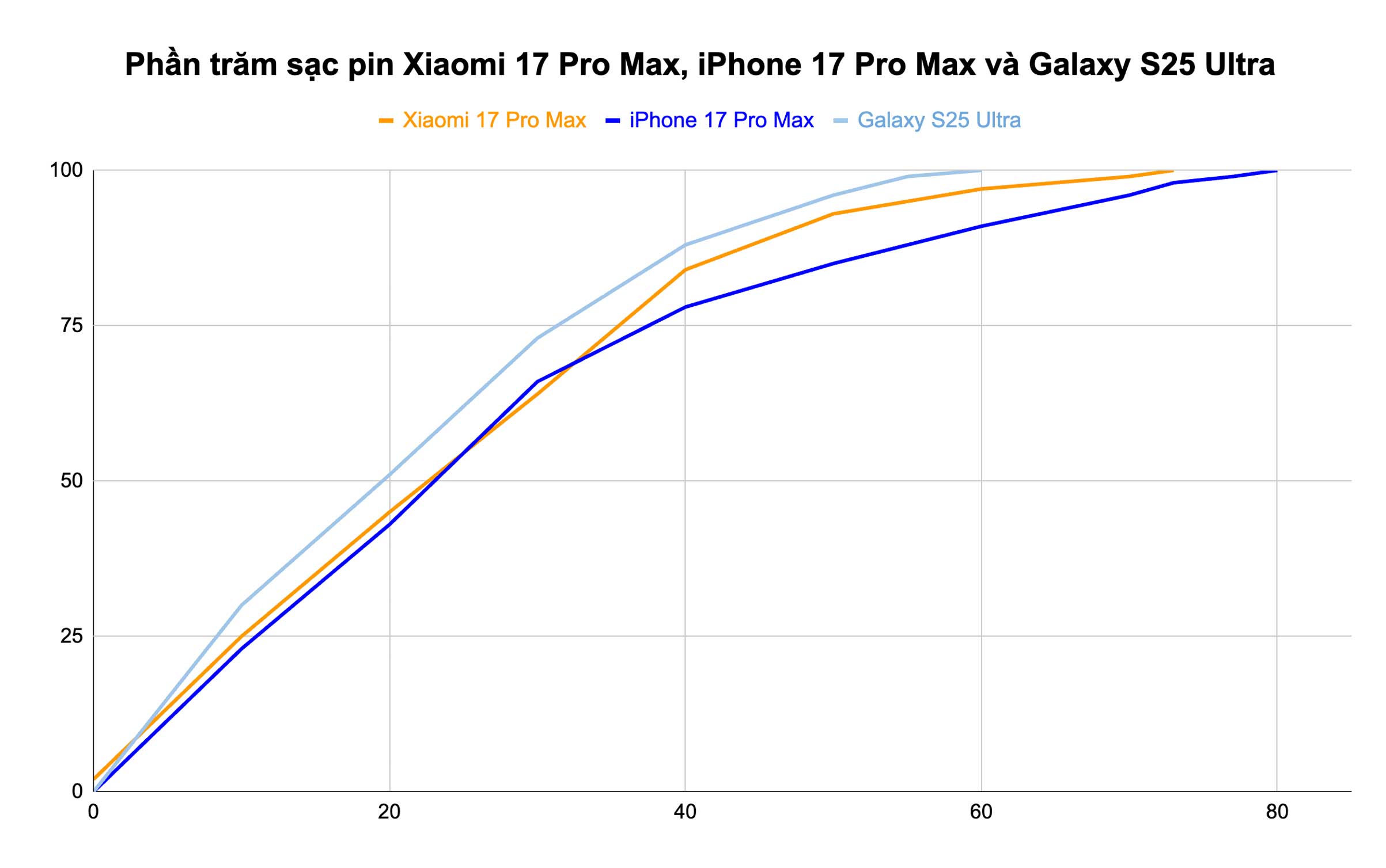 Khi so sánh với một vài đối thủ khác như iPhone 17 Pro Max hay Galaxy S25 Ultra, thời gian sạc trên Xiaomi 17 Pro Max với củ sạc thứ ba không tỏ ra lợi thế quá lớn. Cụ thể hơn, máy sạc nhanh hơn khoảng 8 phút so với iPhone, và thậm chí kém tới 13 phút so với Galaxy S25 Ultra. Ở các cột mốc quan trọng như sau 20 phút hay 30 phút, phần trăm pin nạp được trên cả ba máy cũng rất tương đồng với nhau, không có sự chênh lệch rõ nét.