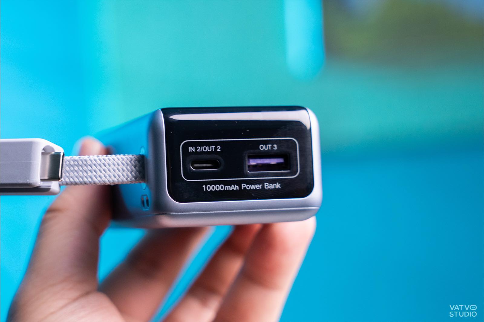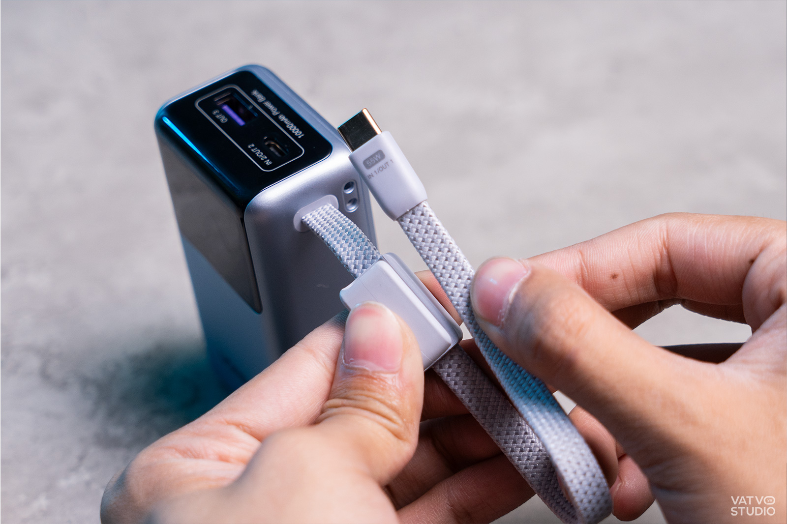 Bù lại, điểm thực dụng nhất mà mình đánh giá cao ở mẫu sạc này so với CUKTECH chính là sợi cáp USB-C được tích hợp sẵn trên thân. Với CUKTECH 10 Mini, mình vẫn phải mang thêm một sợi cáp rời để sạc, còn với UGREEN, mình có thể tối giản hóa túi đồ vì sợi dây này vừa dùng để sạc vừa có thể làm quai xách rất chắc chắn.