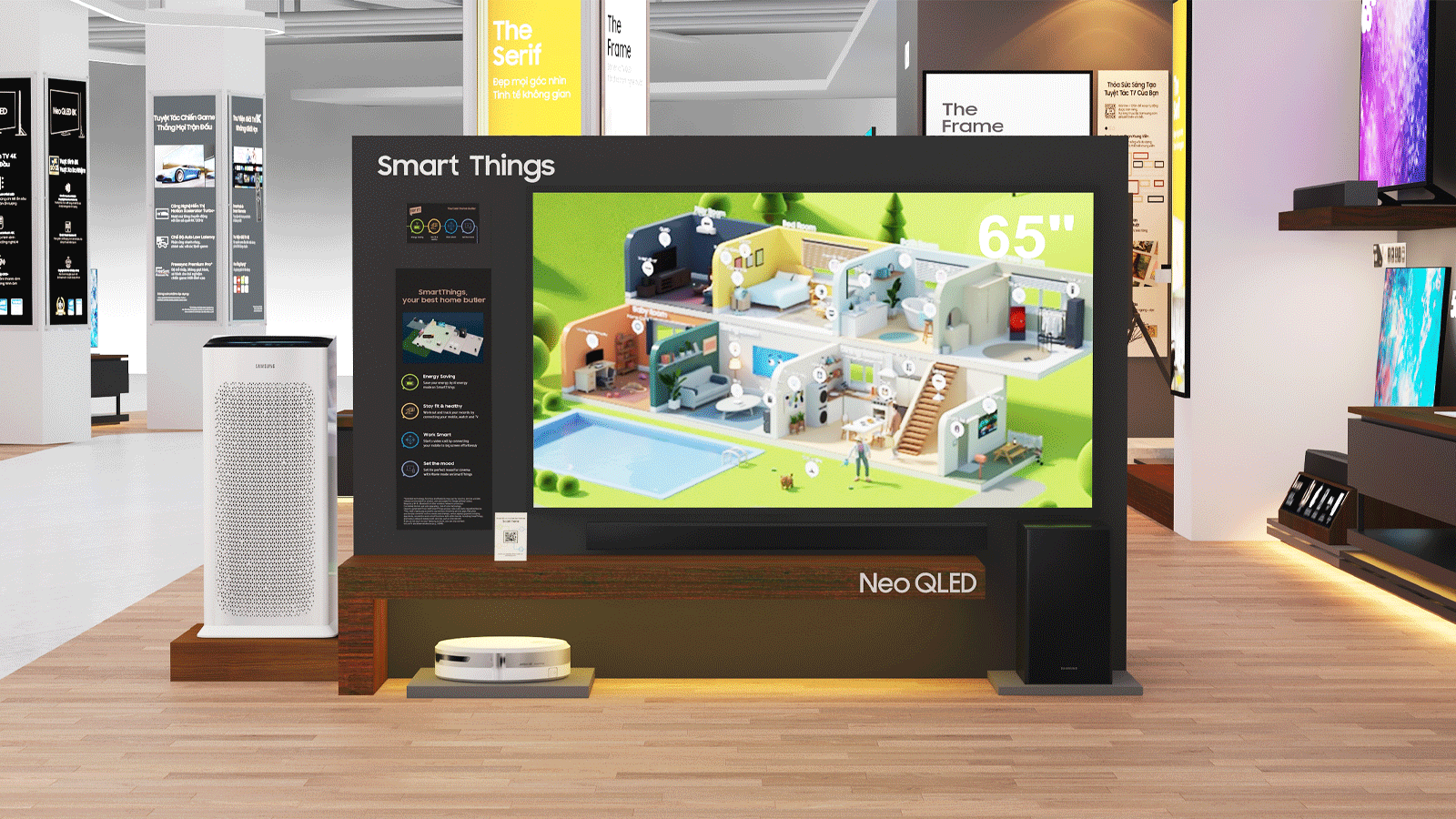 Hiện tại, người dùng có thể trải nghiệm dịch vụ SmartThings tại cửa hàng điện máy Nguyễn Kim (Trần Hưng Đạo, quận 1, TP.HCM) và các đối tác khác của Samsung từ ngày 03/04/2023 với nhiều ưu đãi hấp dẫn. Theo đó, từ ngày 15/04/2023 đến ngày 08/05/2023, khách hàng đặt trước TV Neo QLED 8K hoặc OLED sẽ nhận gói quà tặng trị giá lên đến 47 triệu đồng (áp dụng tùy dòng sản phẩm), bao gồm: máy chiếu The Freestyle, bộ loa thanh HW-S800B/XV, gói quà tặng ứng dụng giải trí đẳng cấp (VieON, Galaxy Play, TV360, FPT Play) cùng chương trình trả góp 0% hấp dẫn. Sau ngày 09/05/2023 đến khi hết số lượng ưu đãi, ngoài chương trình trả góp 0%, khách hàng nhận được ưu đãi là bộ loa thanh HW-S800B/XV cùng gói quà tặng ứng dụng giải trí, trị giá lên đến 29 triệu đồng.