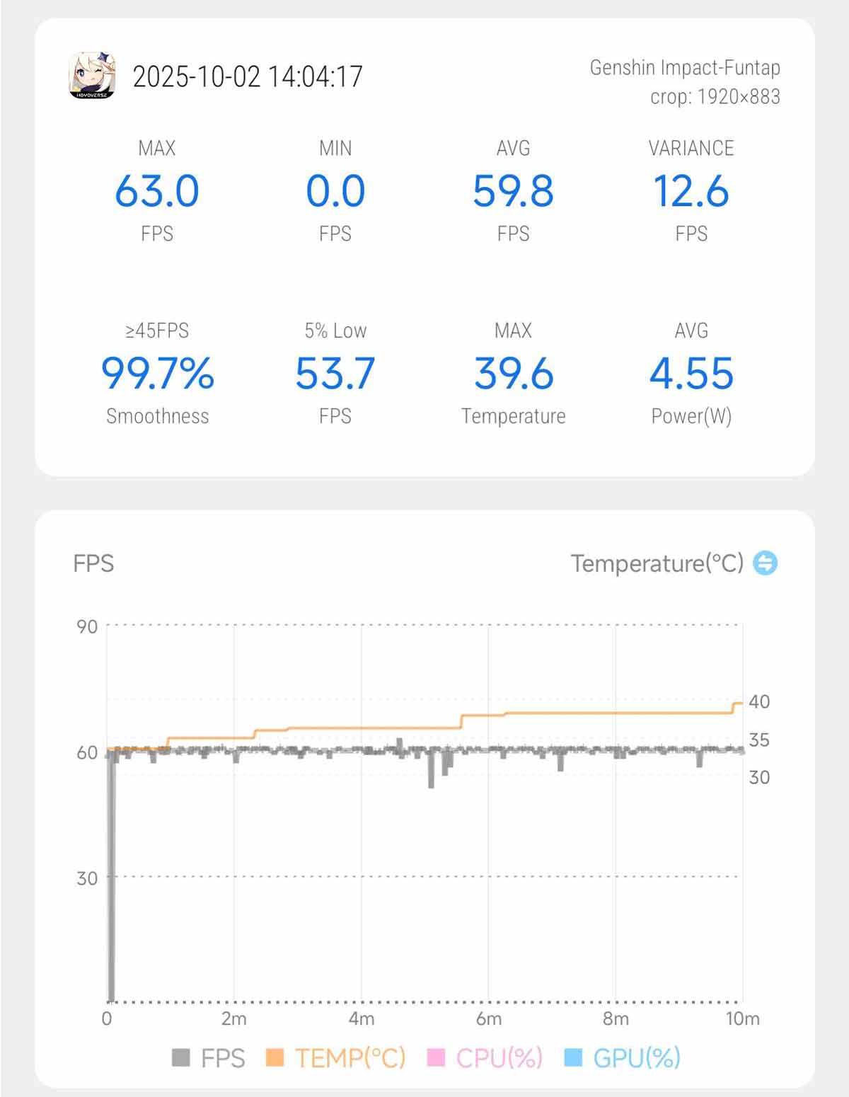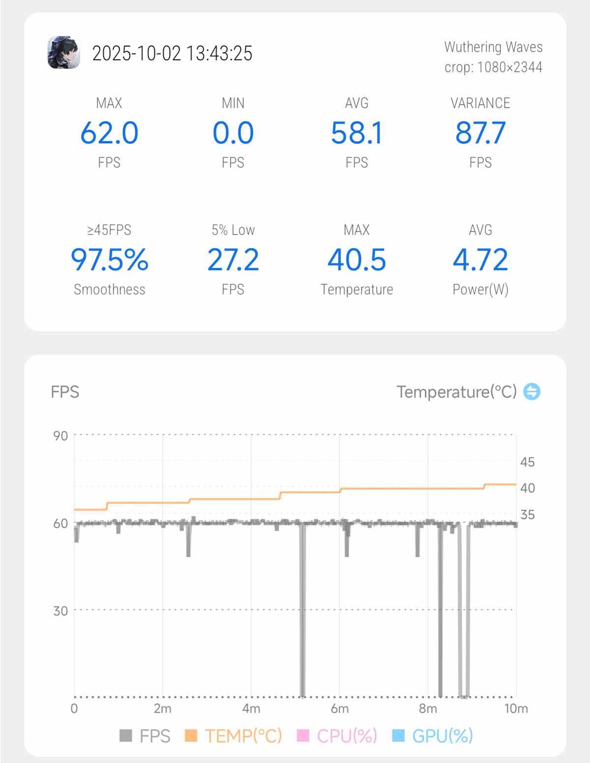 Nhiệt độ của máy khi chơi Wuthering Waves khi này sẽ nhỉnh hơn so với Genshin Impact, loanh quanh 39,5 độ C. Mức tiêu thụ điện năng 4,72W là hoàn toàn chấp nhận được cho một tựa game rất nặng như vậy.