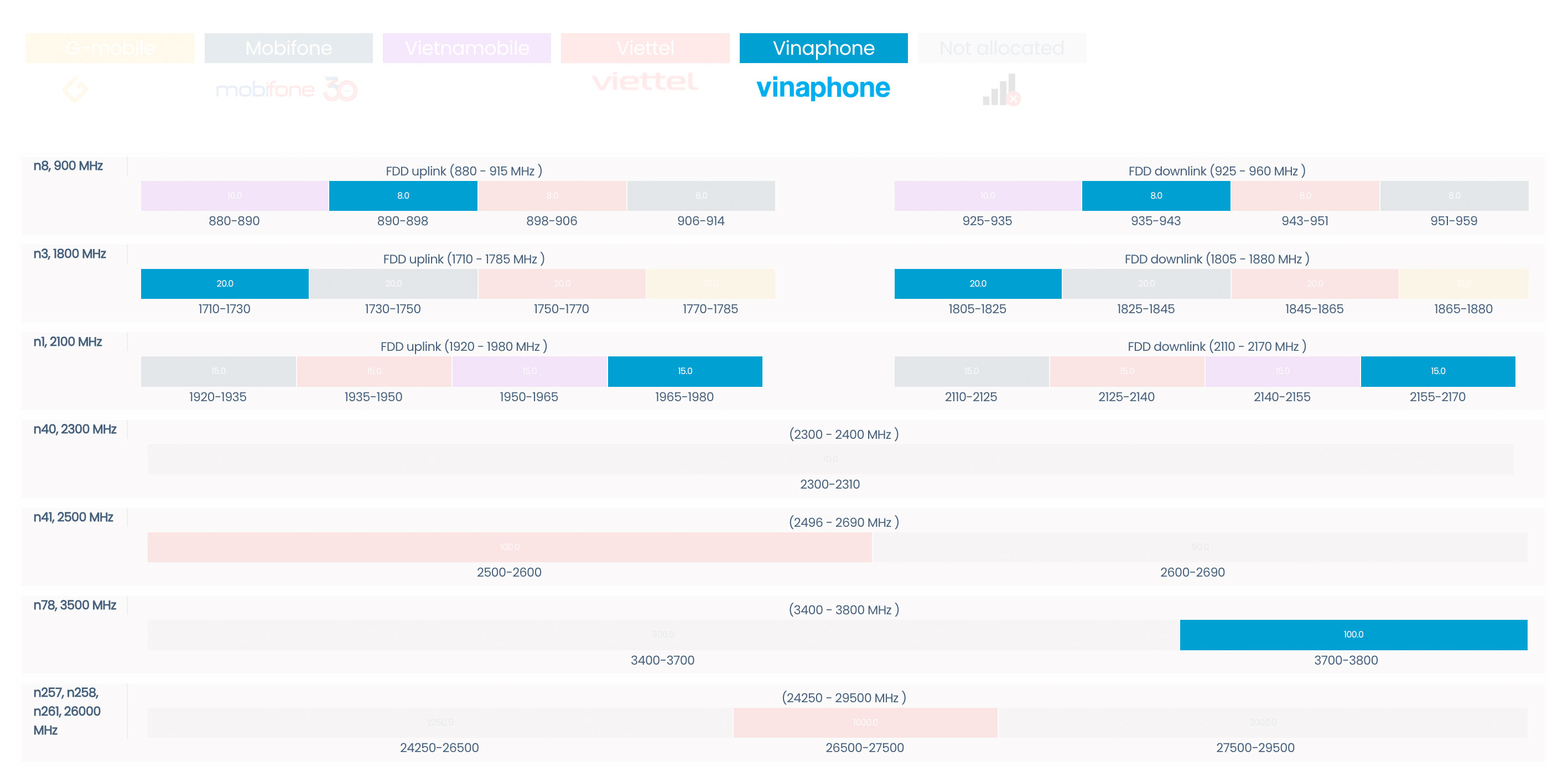 Theo thông tin từ trang Spectrum Tracker, mức 3.700 – 3.800 MHz của mạng 5G VinaPhone sẽ tương ứng với băng tần n78. Về lý thuyết, hầu hết mẫu smartphone trên thị trường đều được tích hợp băng tần này, do đó người dùng có thể sử dụng 5G VinaPhone một cách dễ dàng. Ngay cả với các thiết bị xách tay như vivo iQOO Z9 Turbo+ hay Pixel 9 Pro Fold cũng hỗ trợ băng tần n78, về lý thuyết sẽ có thể dùng được 5G của nhà mạng này.