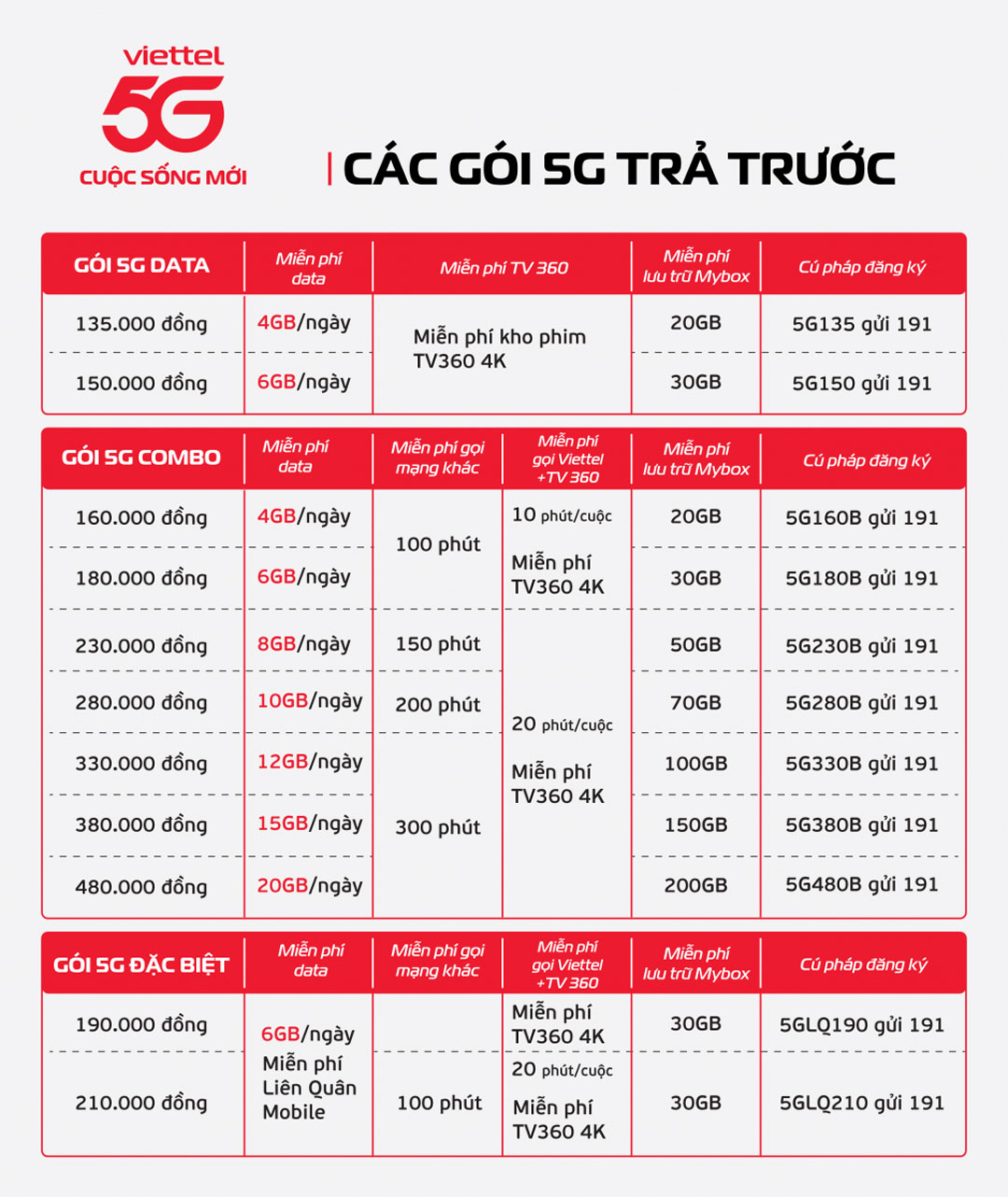 | Ưu đãi Data | 240GB / tháng (8GB / ngày) | 180GB / tháng (6GB / ngày) |