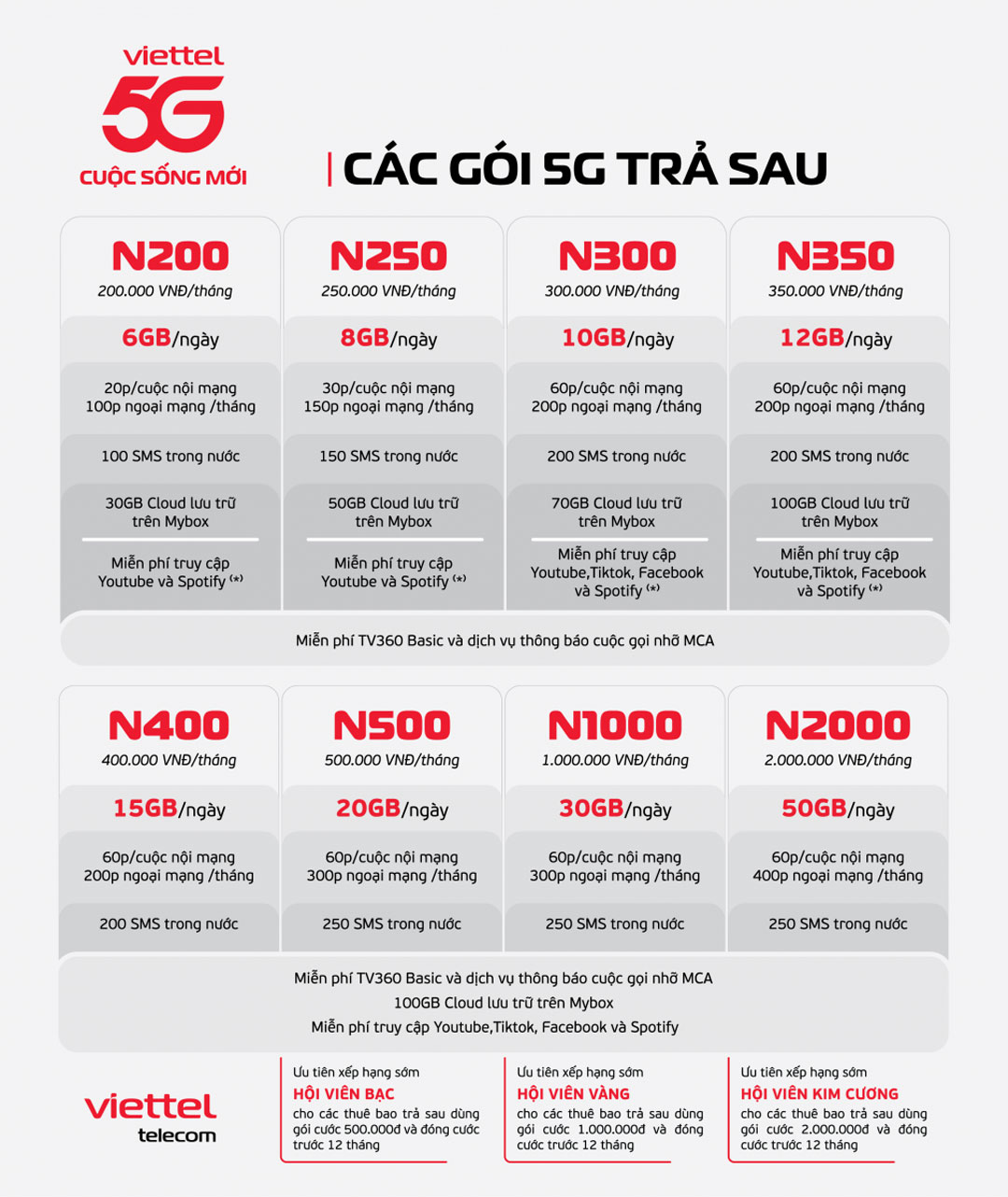 | Ưu đãi khác | Miễn phí Data Zalo, YouTube, TikTok, Facebook, WhatsApp Miễn phí nội dung số VTVcab, SPOTV của MyTV Mobile | Miễn phí 30 GB lưu trữ Mybox Miễn phí TV360 4K |