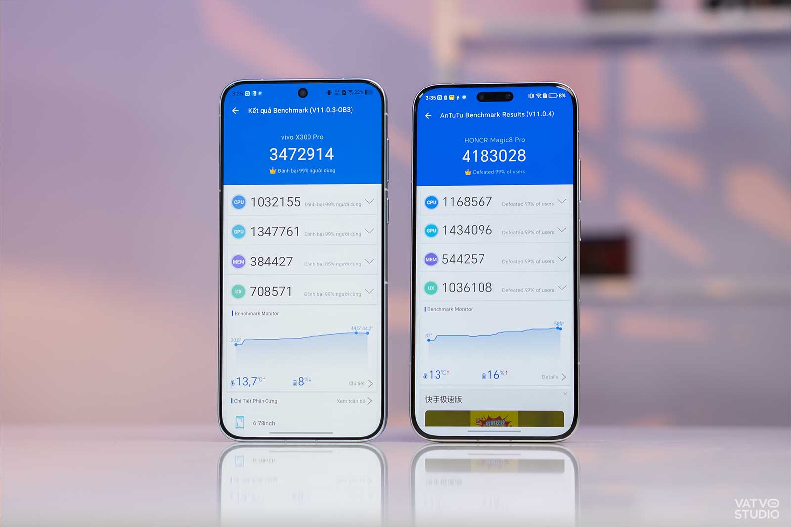 Về hiệu năng, cả Snapdragon 8 Elite Gen 5 trên HONOR Magic8 Pro và Dimensity 9500 trên vivo X300 Pro đều là những con chip rất mạnh mẽ. Tuy nhiên, về điểm số, HONOR Magic8 Pro áp đảo hoàn toàn khi đạt gần 4,2 triệu điểm AnTuTu Benchmark, cao hơn đáng kể mức 3,4 triệu điểm của Dimensity 9500.