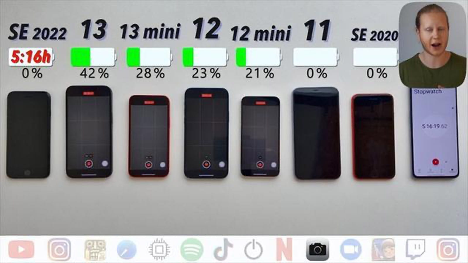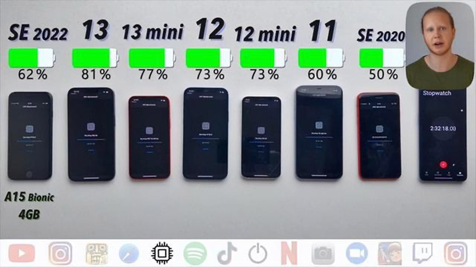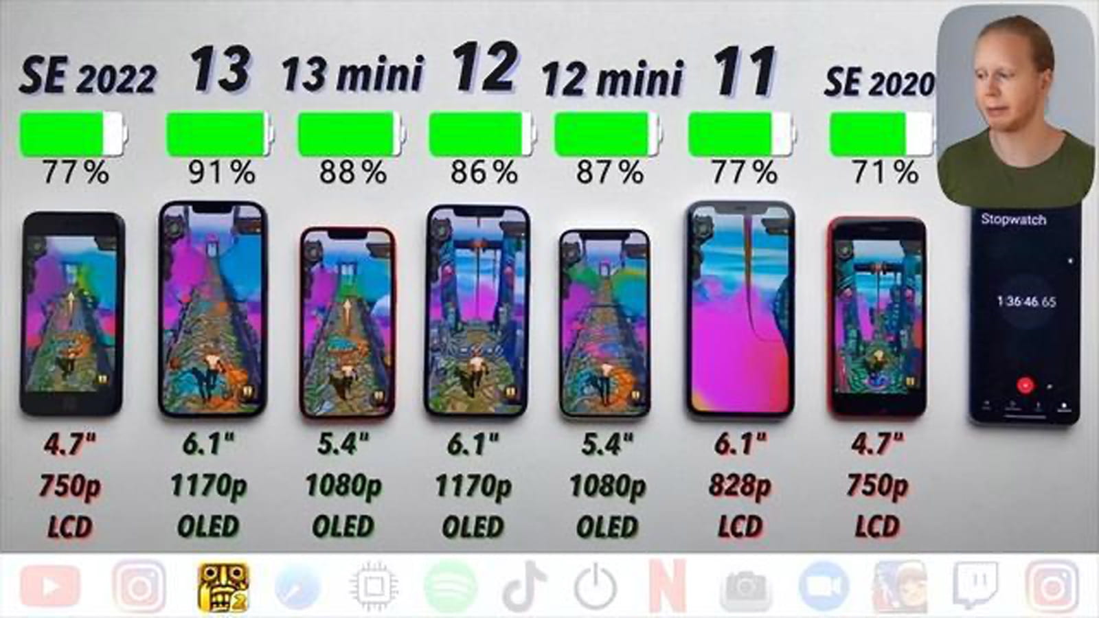 Trong bài đánh giá pin, một YouTuber đã chọn 14 ứng dụng để đo thời lượng sử dụng của 7 mẫu iPhone trên. Sau khi sạc đầy cả 7 chiếc iPhone này, chúng được cùng một loạt tác vụ giống nhau. Sau 1 giờ 36 phút đầu tiên dung lượng pin của các máy lần lượt như sau: