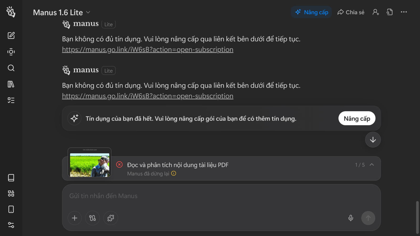 Đối với những người có nhu cầu làm việc liên tục hoặc cần làm nhiều bài thuyết trình, số lượng thao tác được phép dùng trong ngày là yếu tố rất quan trọng. Ở khía cạnh này, Gemini và Claude cho phép người dùng tạo rất nhiều slide trong ngày, đáp ứng thoải mái và duy trì mạch làm việc ổn định cho người có nhu cầu sử dụng cao. Ngược lại, Manus áp dụng một hạn mức khá khắt khe với giới hạn 300 credit mỗi ngày. Với mức giới hạn này, người dùng sẽ bị hạn chế khá nhiều khi chỉ có thể tạo tối đa 2 slide thuyết trình một ngày là hệ thống sẽ ngừng hỗ trợ.