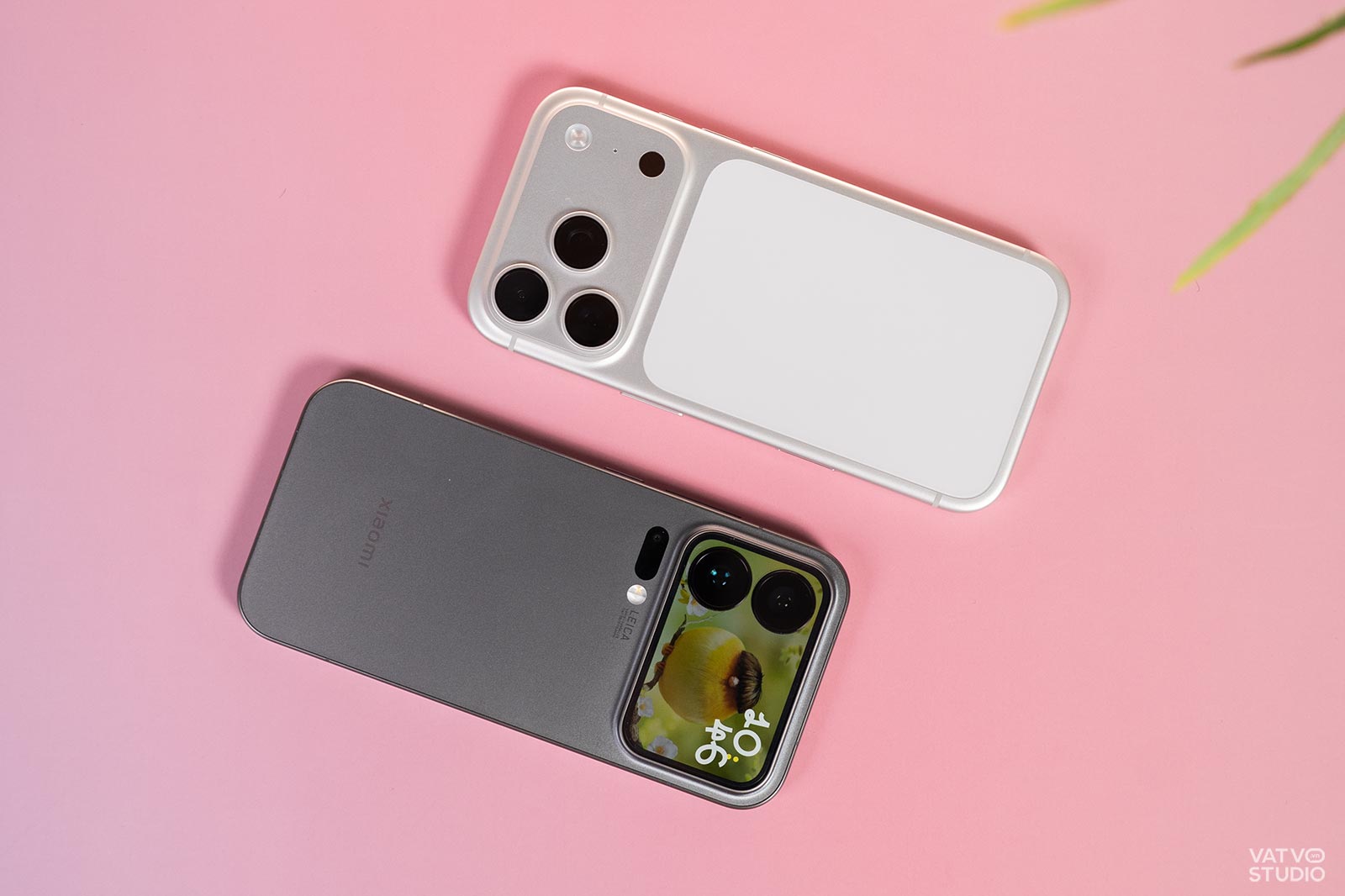 Nhìn từ phía sau, cả hai thiết bị đều tạo ấn tượng với cụm camera được đặt trên một phần gồ lên so với mặt lưng kính. Tuy nhiên, cách tiếp cận của hai hãng lại hoàn toàn khác biệt. iPhone 17 Pro vẫn trung thành với cụm ba camera xếp theo hình tam giác quen thuộc, trong khi Xiaomi 17 Pro lại tích hợp thêm một màn hình phụ nhỏ ngay bên cạnh hệ thống camera, tạo ra tổng thể thiết kế rất độc đáo và sáng tạo.