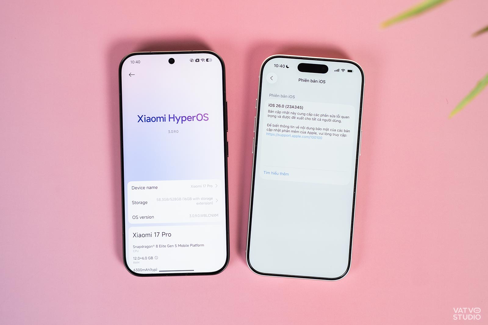 Xiaomi 17 Pro đang được cài sẵn HyperOS 3 dựa trên nền Android 16, cho trải nghiệm mượt mà và ổn định. Trong khi đó, iPhone 17 Pro được cài sẵn iOS 26, mang đến hiệu ứng “kính lỏng” Liquid Glass đẹp mắt và tự nhiên.