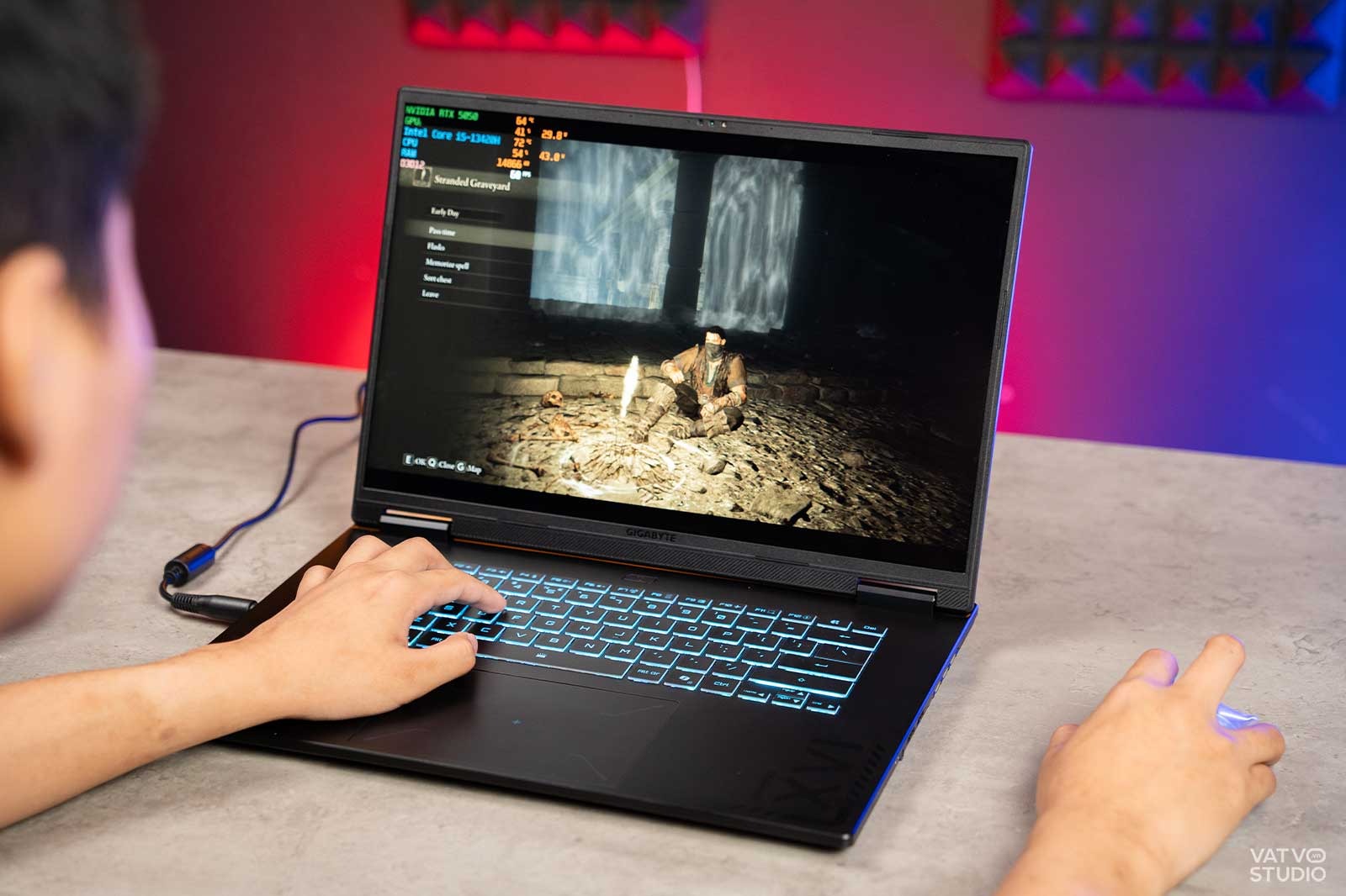 Chuyển sang các tựa game AAA nặng đô hơn, Elden Ring là bài kiểm tra đầu tiên trên Gigabyte Gaming A16. Ở thiết lập 1080p High, máy duy trì mức FPS ổn định từ 65 – 75. Con số này ở mức khá, đủ tốt để người dùng có thể trải nghiệm thế giới giả tưởng rộng lớn của game mà không lo giật, khựng.