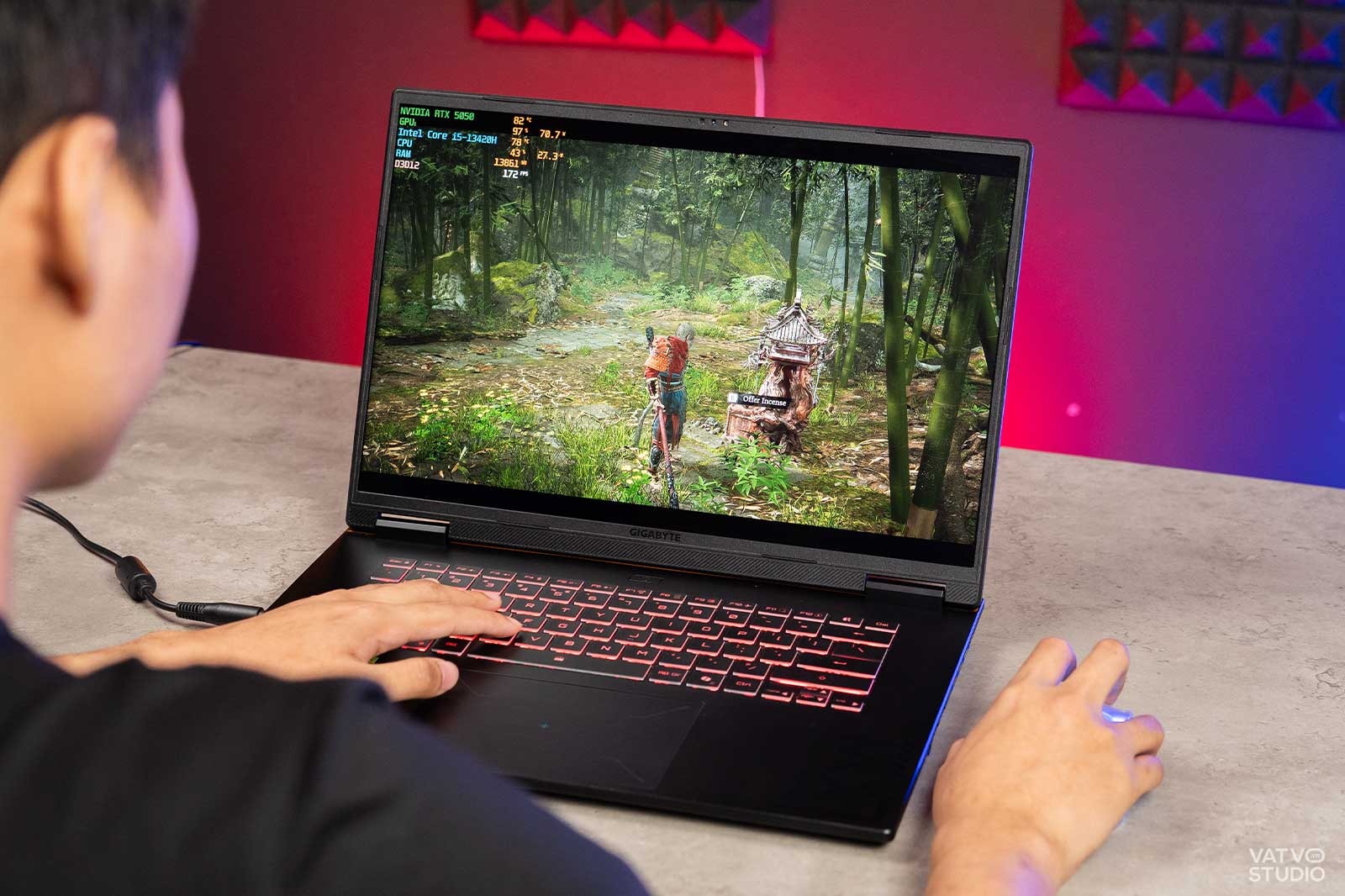 Bù lại, một sự cải thiện đáng chú ý của Gigabyte Gaming A16 so với các dòng laptop gaming của Gigabyte trước đây là nhiệt độ CPU, GPU khi chơi game. Ở các tựa game Liên Minh Huyền Thoại hay Elden Ring, nhiệt độ CPU hay GPU chỉ dao động trong khoảng 60 – 70 độ C, khá mát. Ngay cả với những tựa game nặng như Cyberpunk 2077 hay Black Myth: Wukong, mức nhiệt các linh kiện này cũng chỉ dao động từ 75 – 80 độ C, không quá nóng.