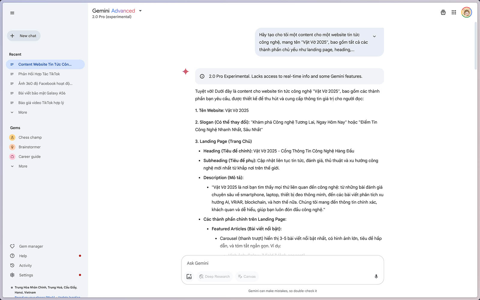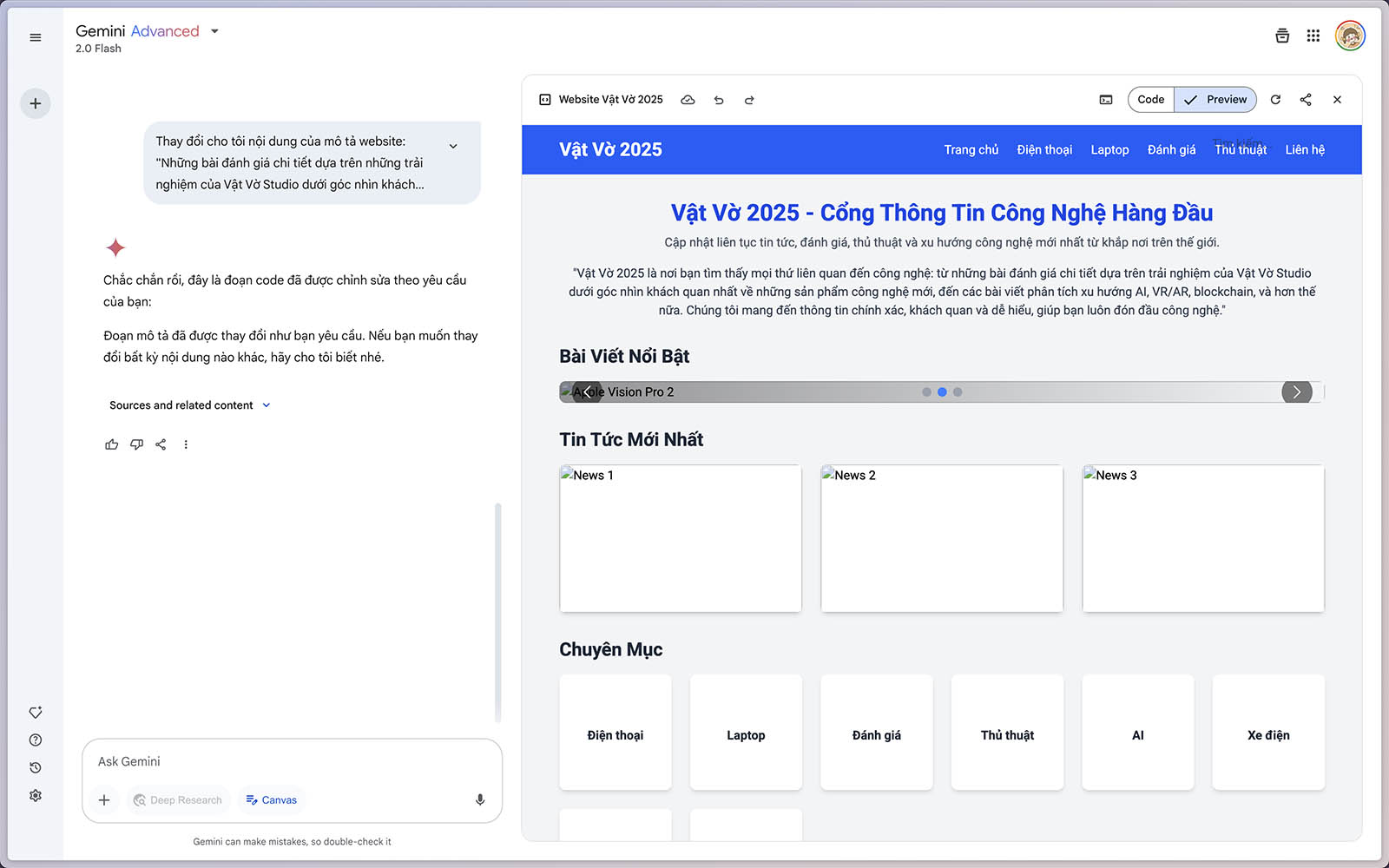 Trong bài viết dưới đây, mình sẽ thử tạo một website về tin tức công nghệ với tính năng Canvas mới trong Gemini. Mình cũng sẽ thực hiện các chỉnh sửa với website, từ đó đánh giá giao diện cũng như khả năng hoạt động của tính năng này.