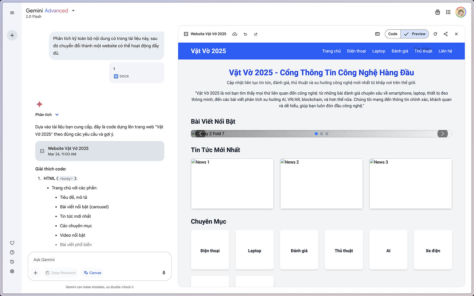 Sau khi tạo thành công, mình chuyển toàn bộ nội dung AI đưa ra vào trong Google Docs, sau đó xuất dưới dạng tệp tin Word (.docx). Trở lại Gemini, mình kích hoạt tính năng Canvas, tải tệp tin lên cùng yêu cầu: “Phân tích kỹ toàn bộ nội dung có trong tài liệu này, sau đó chuyển đổi thành một website có thể hoạt động đầy đủ.”.