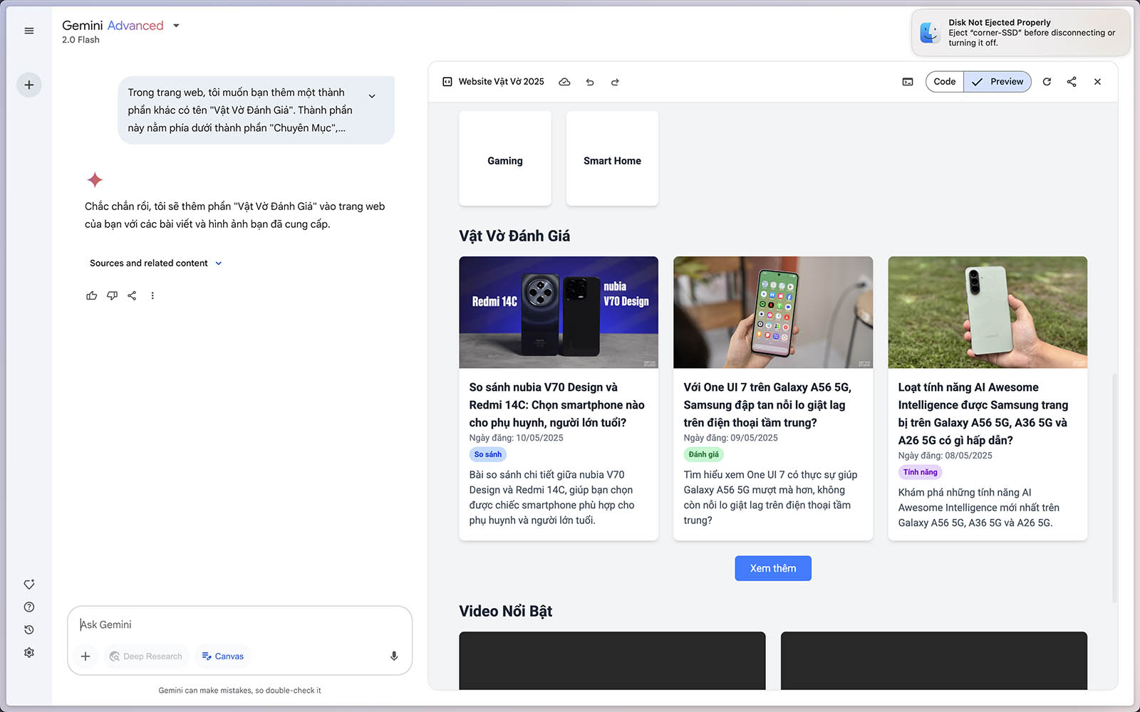 Người dùng cũng có thể yêu cầu Gemini thêm một thành phần vào website. Chẳng hạn, trong bức ảnh dưới đây, mình yêu cầu chatbot thêm một mục “Vật Vờ Đánh Giá” riêng, sau đó thêm các bài viết, ảnh và một nút Xem thêm dưới cùng.
