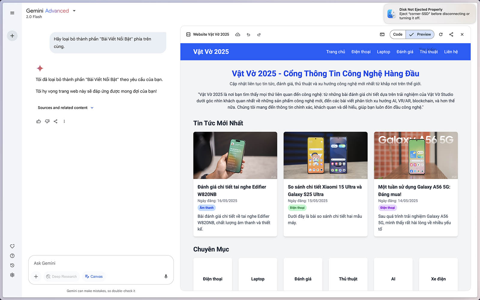Tương tự, người dùng có thể yêu cầu Gemini loại bỏ các thành phần thừa thãi trên website. Các thay đổi được hiển thị trực tiếp tại bên phải màn hình, giúp người dùng dễ dàng hình dung kết quả mà không cần phải sao chép nhiều lần vào phần mềm lập trình.
