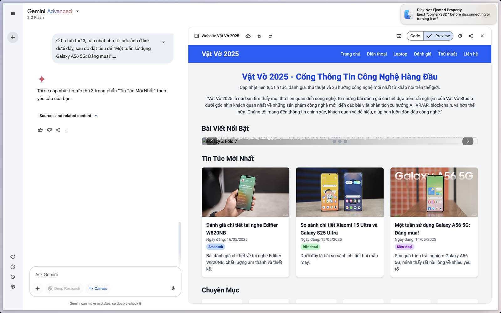 Với một website tin tức, ảnh là thành phần không thể thiếu. Để thêm ảnh và hiển thị trực tiếp lên màn hình Canvas, người dùng có thể tải ảnh lên một website lưu trữ (như Google Drive), sau đó chia sẻ link và yêu cầu Gemini cập nhật theo đường dẫn đó. Chẳng hạn như sau: