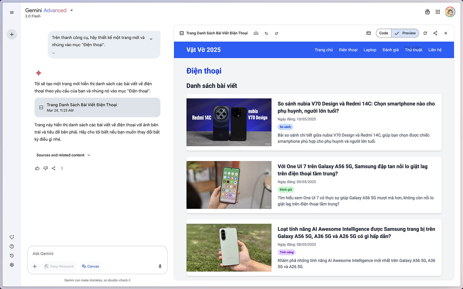 Ngoài ra, mình thử yêu cầu Gemini tạo một trang mới, liên kết với mục “Điện thoại” khi người dùng nhấn vào phía trên thanh công cụ, sau đó thêm các bài viết cần thiết. Sau một khoảng thời gian xử lý, Gemini cũng hoàn thành công việc với giao diện và các bài viết đúng như những gì mình yêu cầu.