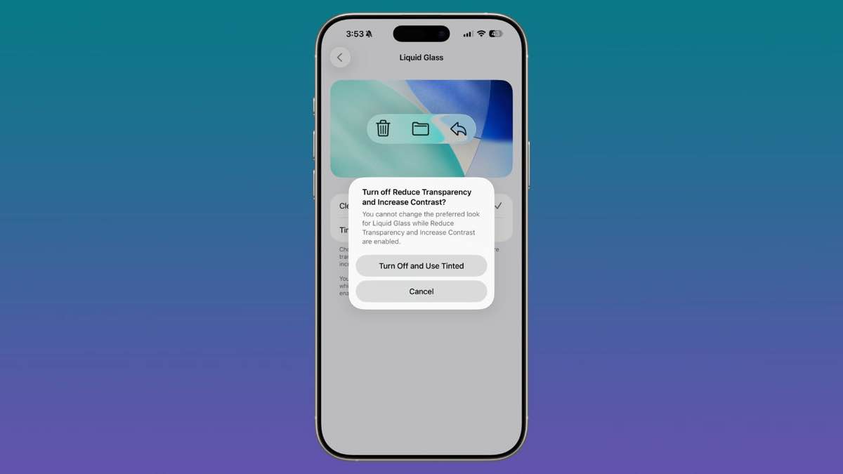 Khi bật chế độ “Tinted” (Nhuộm màu) để giảm độ trong suốt, hệ thống sẽ tự động tắt các tùy chọn Trợ năng “Giảm độ trong suốt” và “Tăng độ tương phản” để tránh xung đột, thay vì yêu cầu người dùng tắt thủ công như trước.