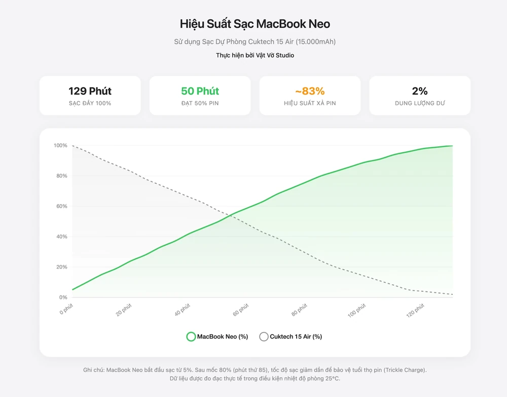 Sau 5 tiếng xử lý công việc liên tục, mình nghỉ trưa và bắt đầu sạc khi máy còn khoảng 5% pin. Kết quả thu được không quá xa so với dự đoán của mình khi sau 1 giờ tiếng, máy đạt mức 59% pin trong khi dung lượng pin dự phòng còn lại 48%. Sau tổng cộng 2 tiếng 9 phút, chiếc MacBook Neo đã được sạc đầy và lúc này viên pin CUKTECH cũng vừa gần cạn dung lượng, chỉ còn 2%. Sau khi sạc xong, mình đã có thể tiếp tục xử lý công việc vào buổi chiều mà không cần lo lắng về pin nữa.
