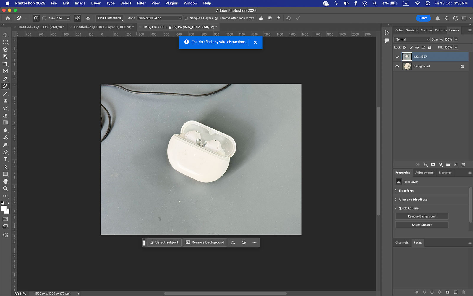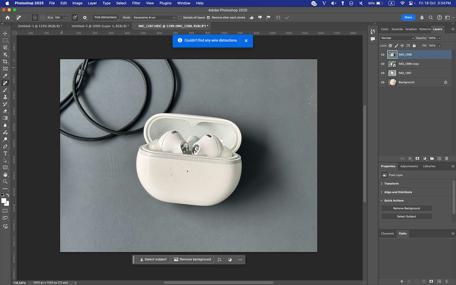 Tuy nhiên, qua trải nghiệm nhanh, Find Distraction hoạt động chưa thật sự ổn định. Chẳng hạn, khi xóa phần dây rối bên cạnh phải chiếc laptop, Find Distraction chỉ xóa nửa sợi dây, khiến bức ảnh trông thiếu chân thật. Còn khi dùng bức ảnh với phần dây “rác” rõ ràng hơn, hệ thống cũng không thể xóa và báo lỗi.