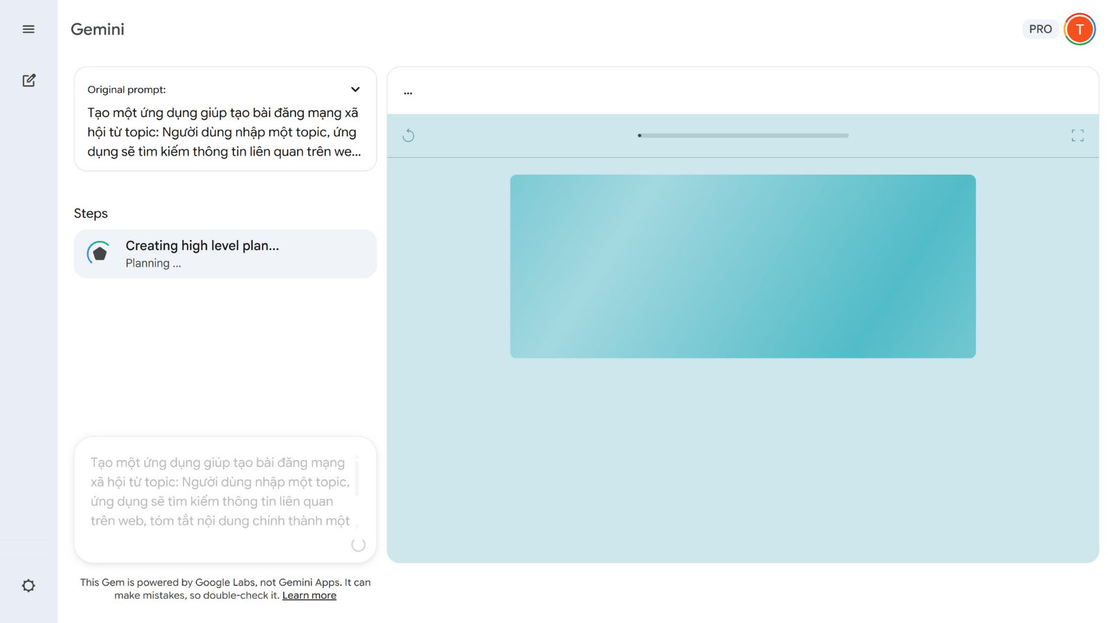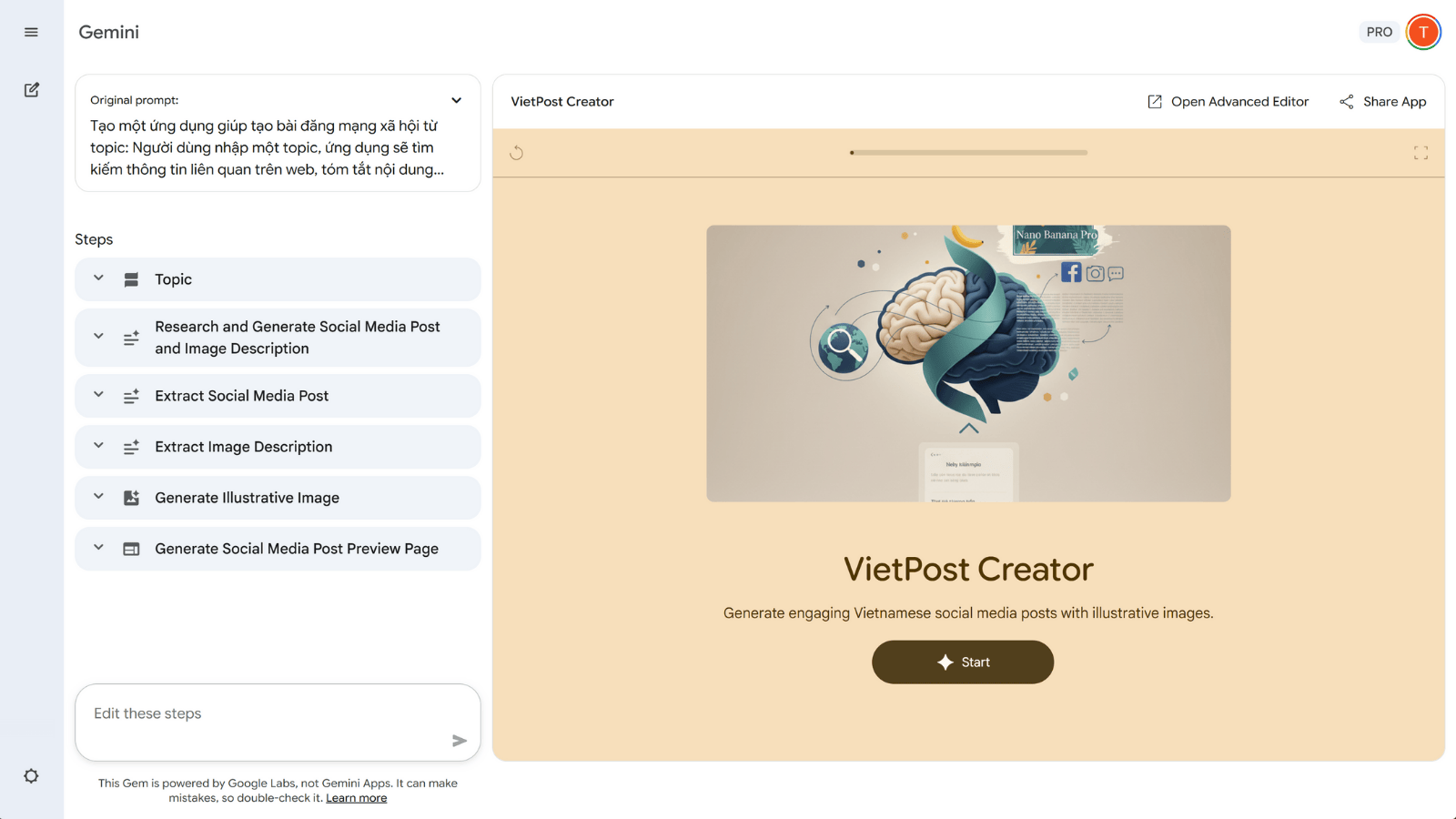 “Tạo một ứng dụng giúp thiết kế bài đăng mạng xã hội từ topic: Khi người dùng nhập một chủ đề, ứng dụng sẽ tìm kiếm thông tin liên quan trên web, tóm tắt nội dung chính thành một bài đăng Facebook hấp dẫn. Sau đó, sử dụng Nano Banana Pro để tạo hình ảnh minh họa phù hợp và hiển thị bản xem trước kết quả trên giao diện để mình tiện theo dõi và sao chép. Lưu ý: bài viết và tiêu đề phải sử dụng tiếng Việt”.