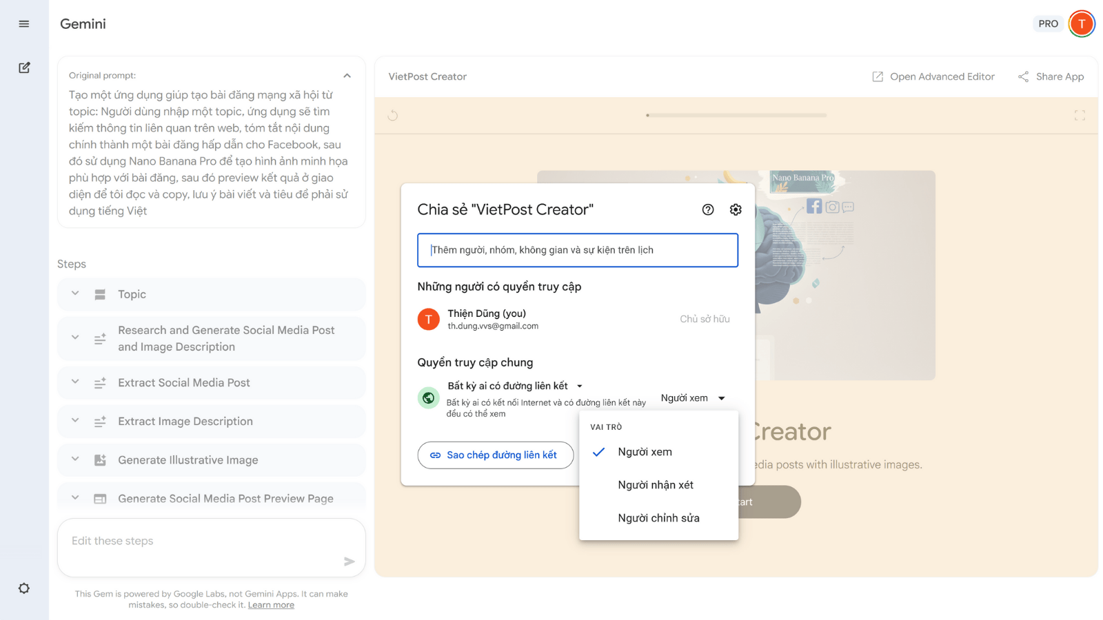 Sau khi đã tinh chỉnh và cảm thấy ưng ý, bạn chỉ cần nhấn lưu để hoàn tất. Đặc biệt, Gemini cho phép bạn chia sẻ ứng dụng vừa tạo dưới dạng một đường liên kết công khai. Cơ chế chia sẻ này được thiết kế tương tự như cách bạn chia sẻ một tệp Google Docs: bạn có thể cấp quyền truy cập để người khác cùng sử dụng ngay lập tức mà không cần phải thiết lập lại từ đầu. Tính năng này mang lại sự thuận tiện tối đa cho việc làm việc nhóm hoặc chia sẻ các công cụ hữu ích với cộng đồng.