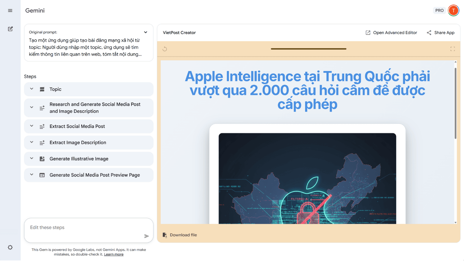 Chỉ trong vài phút, Gem đã tạo xong một ứng dụng hoàn chỉnh và có thể đưa vào sử dụng ngay. Các thành phần từ tiêu đề, nội dung cho đến hình ảnh tạo bởi Nano Banana đều được Gem tự động tìm kiếm và xử lý từ đầu đến cuối, cho ra kết quả rất phù hợp với một bài đăng Facebook. Tuy nhiên, nếu chưa thực sự ưng ý, bạn hoàn toàn có thể bổ sung yêu cầu để tinh chỉnh ứng dụng sao cho sát nhất với tiêu chí và nhu cầu riêng của mình.