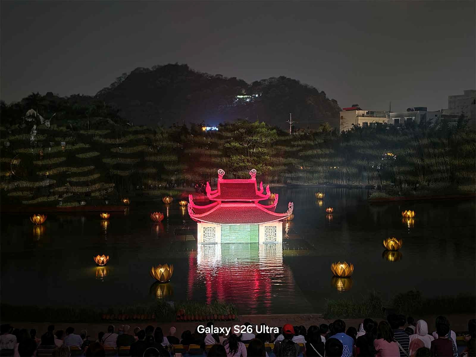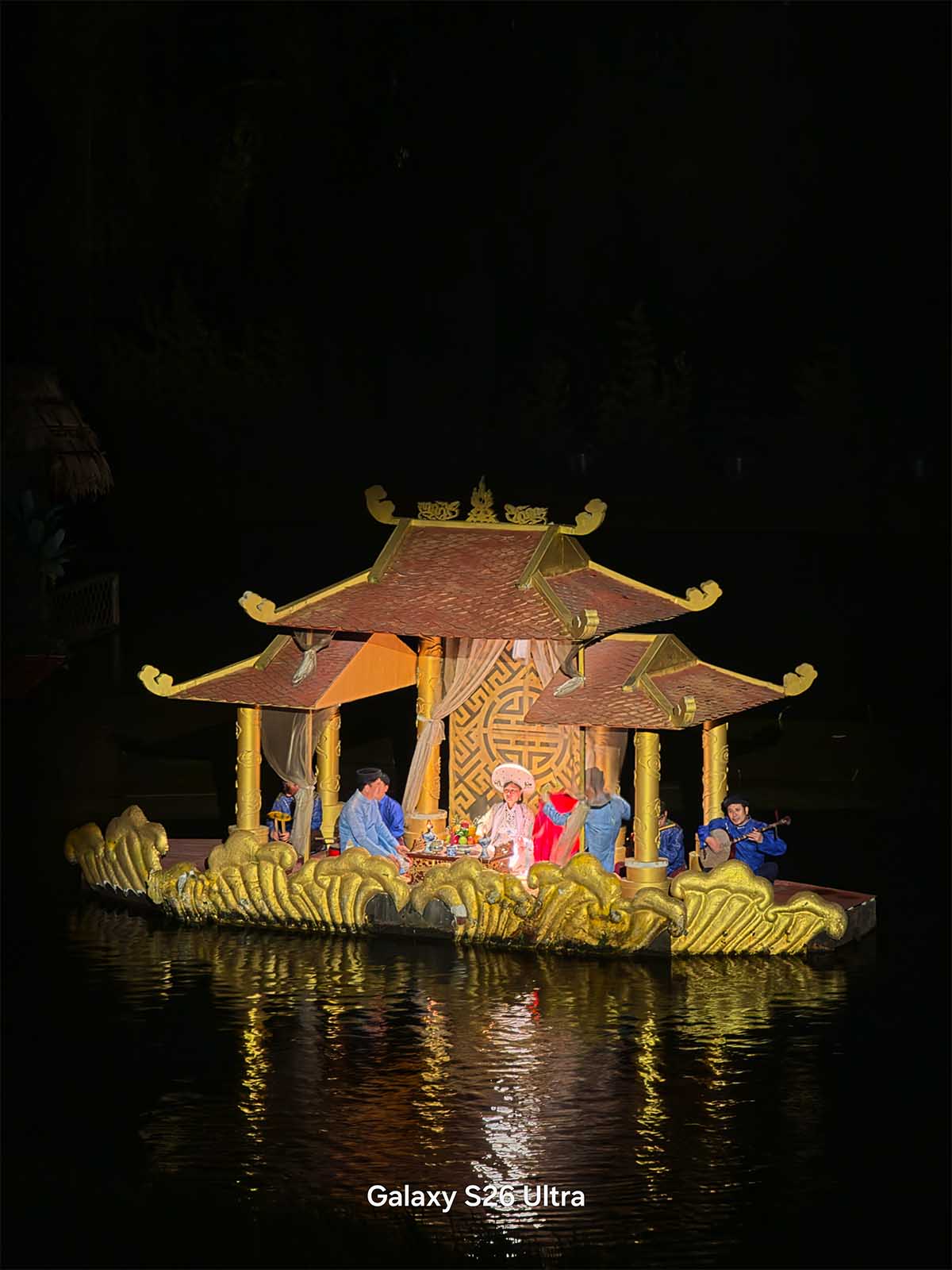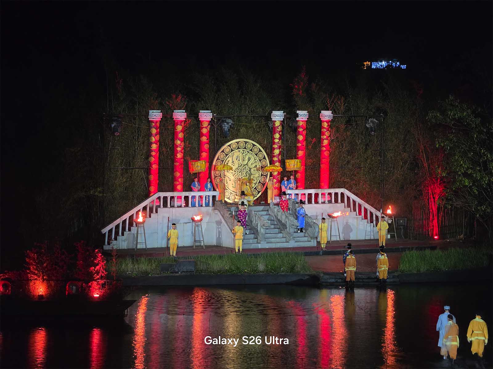 Bên cạnh các đêm nhạc sôi động, mình cũng đã mang S26 Ultra đi thưởng thức “Tinh Hoa Bắc Bộ” – một show thực diễn văn hóa rất nổi tiếng để kiểm chứng khả năng chụp đêm trong một điều kiện khác. Khác với sự hỗn loạn của ánh sáng concert, show diễn này có môi trường ánh sáng tĩnh lặng và thuận lợi hơn, không có đèn laser quét liên tục hay khói nhân tạo dày đặc. Trong bối cảnh này, năng lực thực sự của Galaxy S26 Ultra được phát huy tối đa, đúng với những gì người dùng kỳ vọng ở một thiết bị cao cấp.