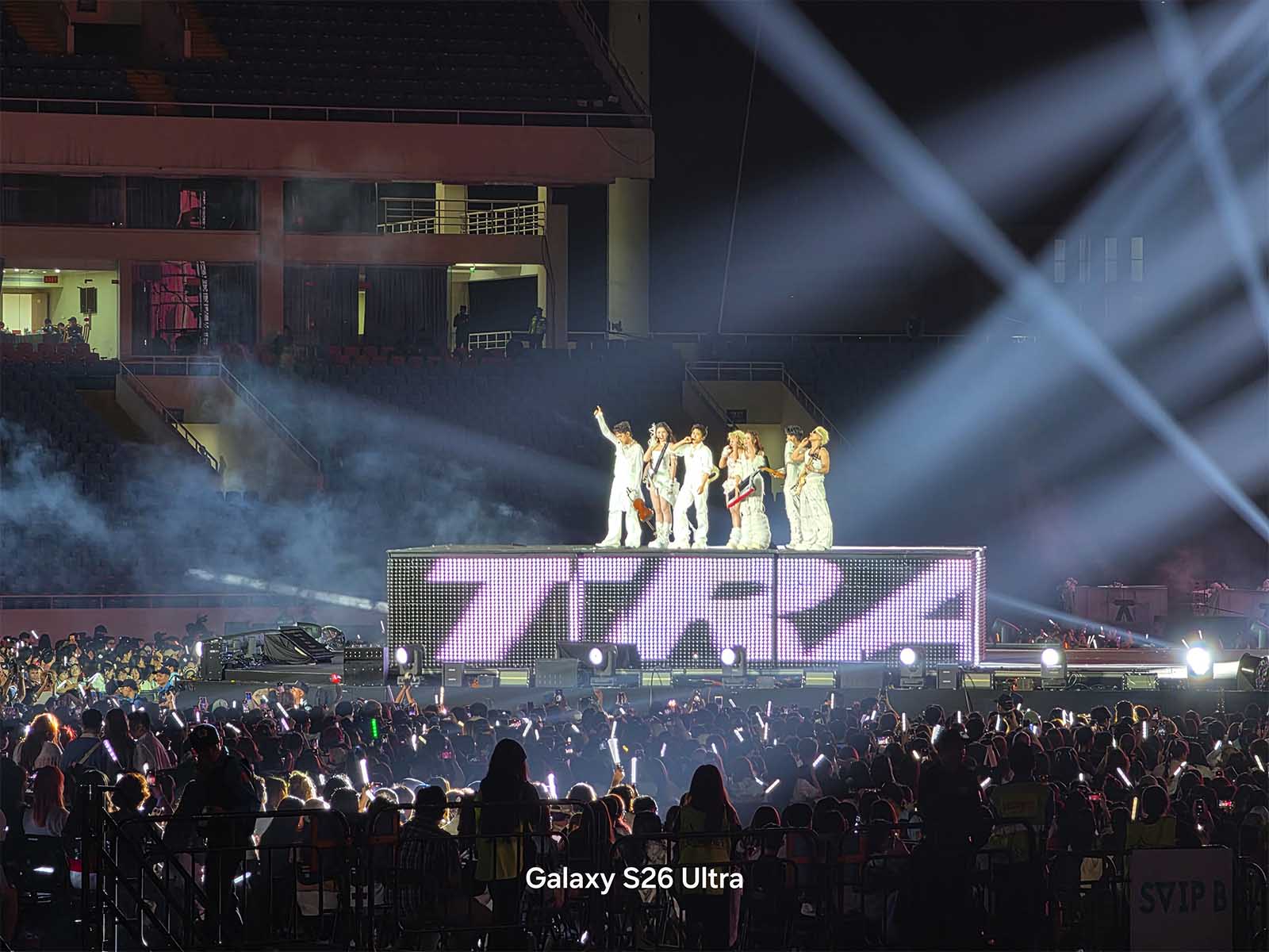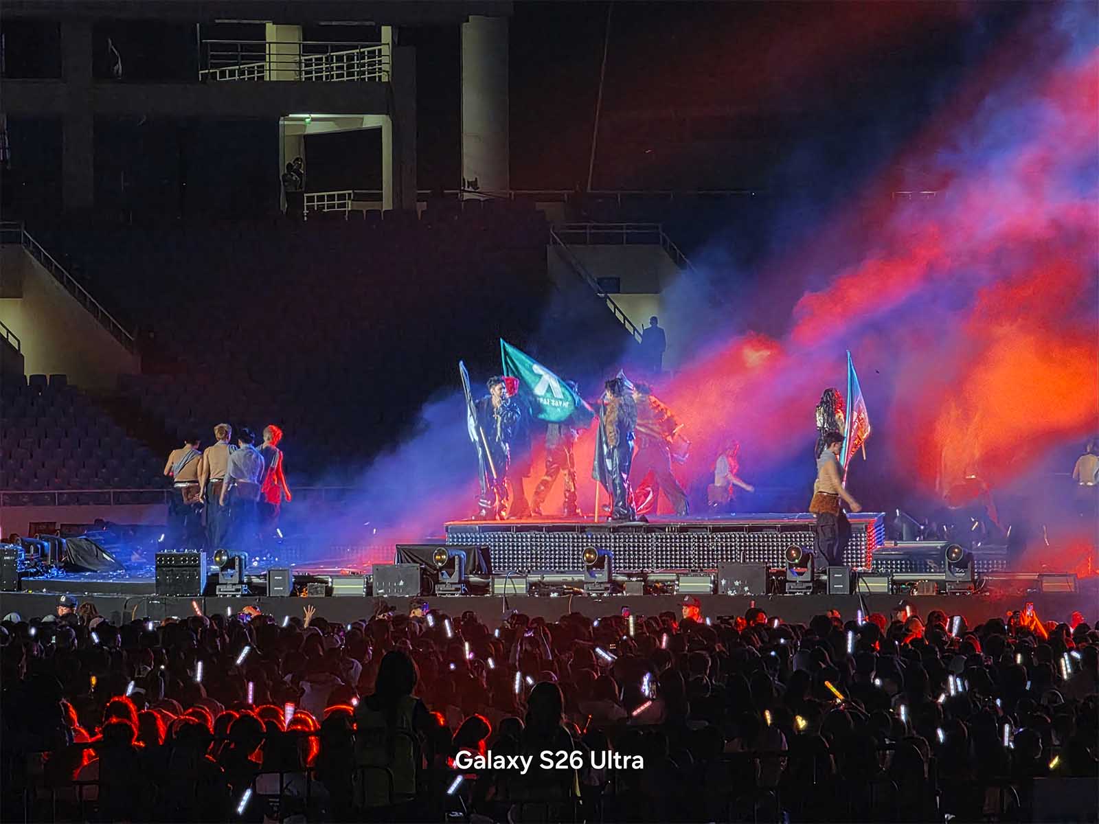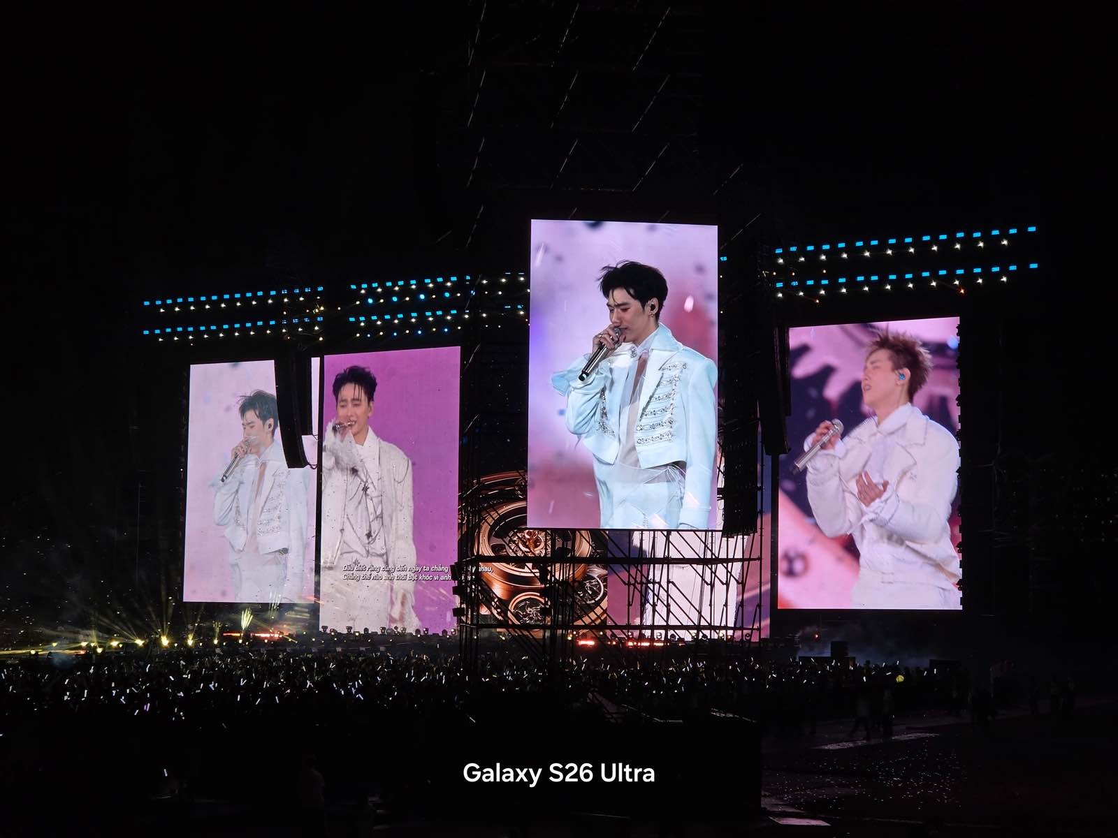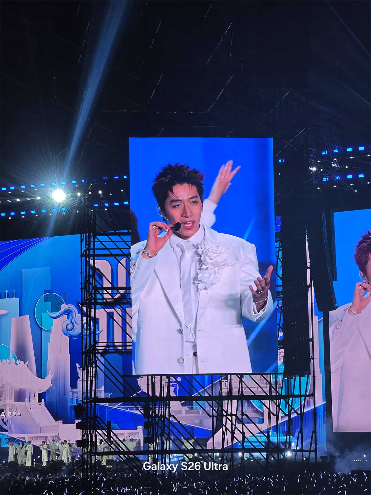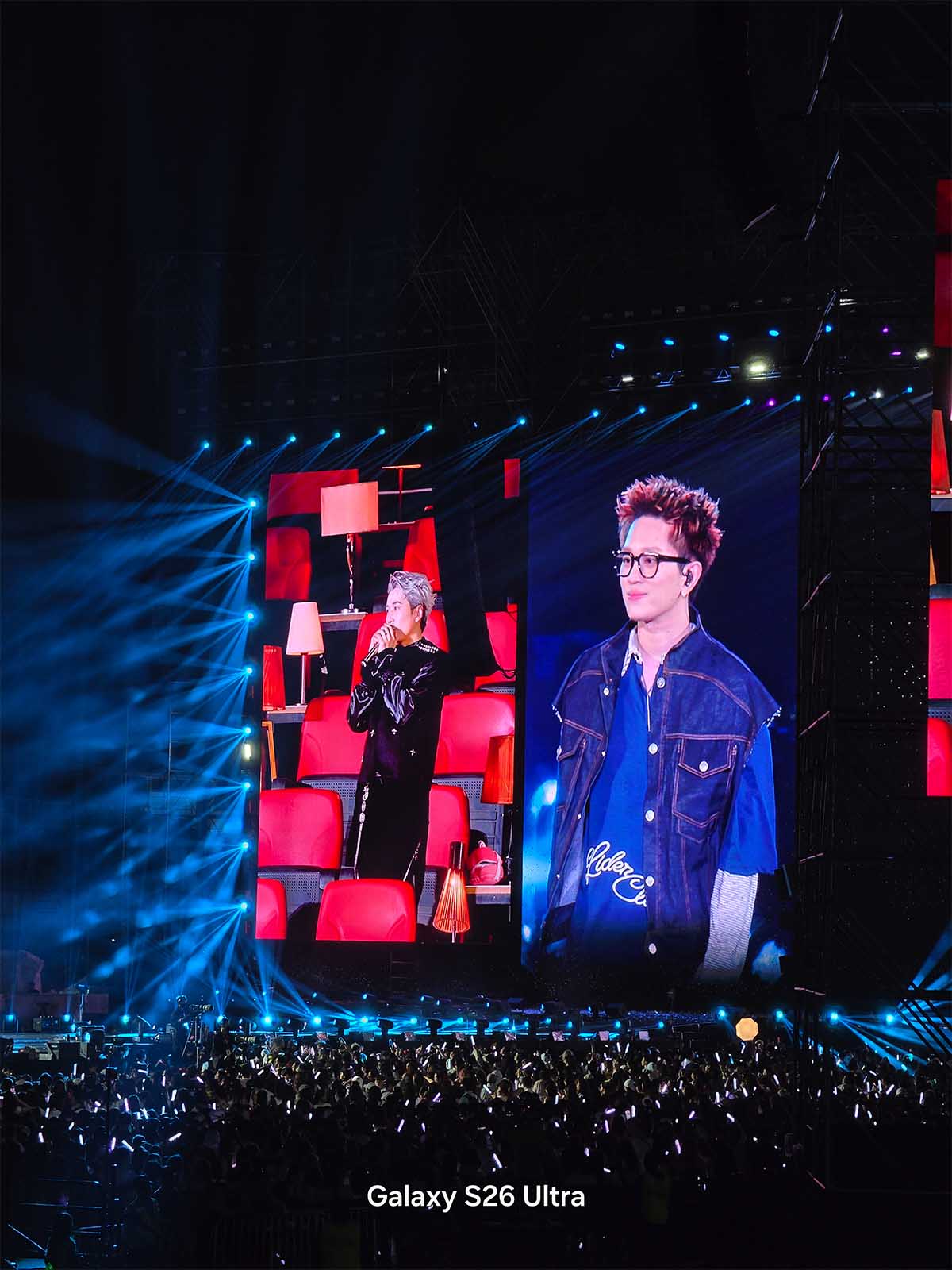 Ở concert, mình phát hiện ra một chi tiết khá thú vị. Mình đứng ở một khu vực (zone) khá xa sân khấu, và xung quanh có rất nhiều bạn fan cũng giơ điện thoại lên để quay. Tuy nhiên, phần lớn các thiết bị khác chỉ có thể quay góc rộng bao quát hoặc quay các màn hình LED phụ hai bên, bởi giới hạn phần cứng không cho phép họ phóng to vào giữa sân khấu mà vẫn giữ được chi tiết. Nhưng với Galaxy S26 Ultra, giới hạn khoảng cách dường như bị xóa nhòa.