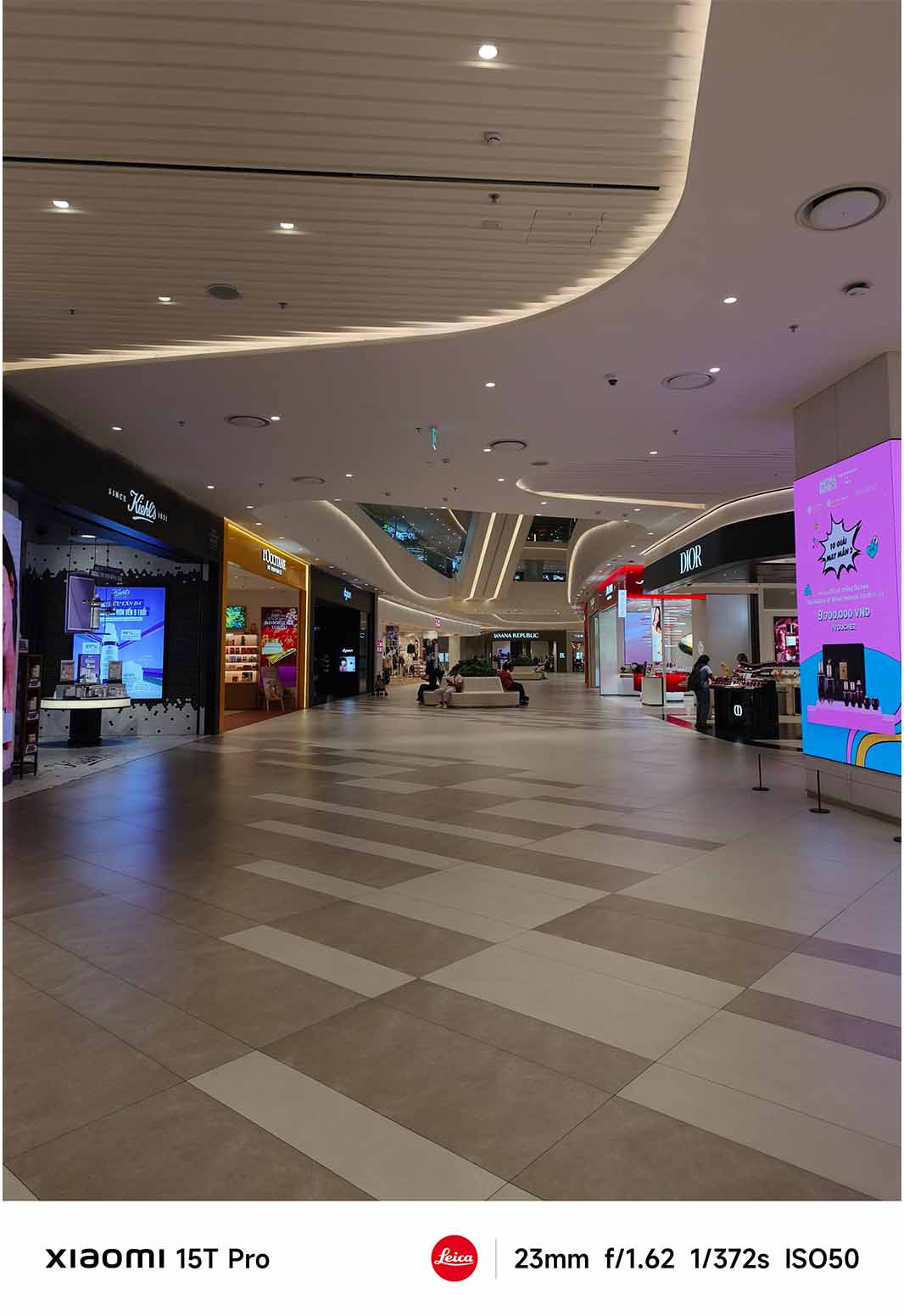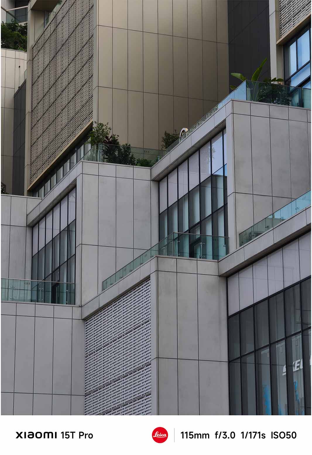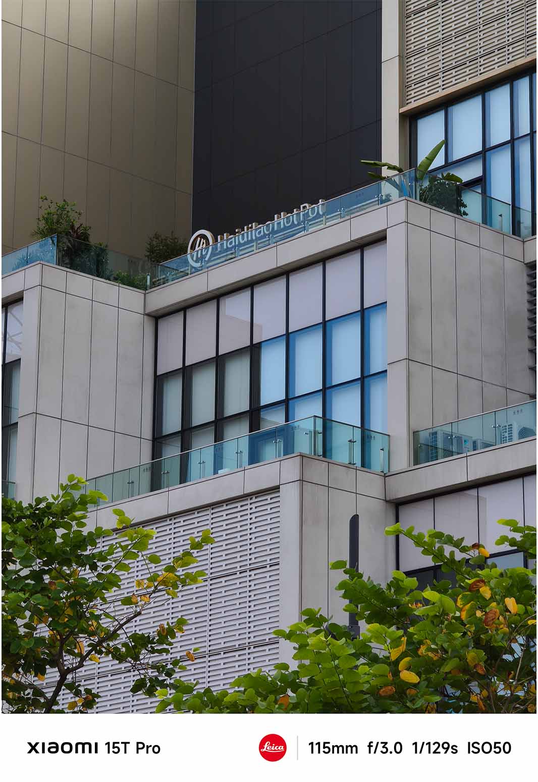 Chẳng hạn, tại một địa điểm khá nổi tiếng là Lotte Mall West Lake Hà Nội, mình có thể tận dụng camera trên Xiaomi 15T Pro để “bắn” các khối nhà liền kề nhau, một điểm đặc trưng tại trung tâm thương mại này. Các khối nhà được máy tái tạo với nhiều chi tiết, các phần chuyển tiếp được xử lý mượt mà. Thậm chí, mình có thể zoom kỹ hơn vào cây cối trang trí bên sảnh ngoài của các khối nhà mà vẫn có thể thấy rõ chi tiết.