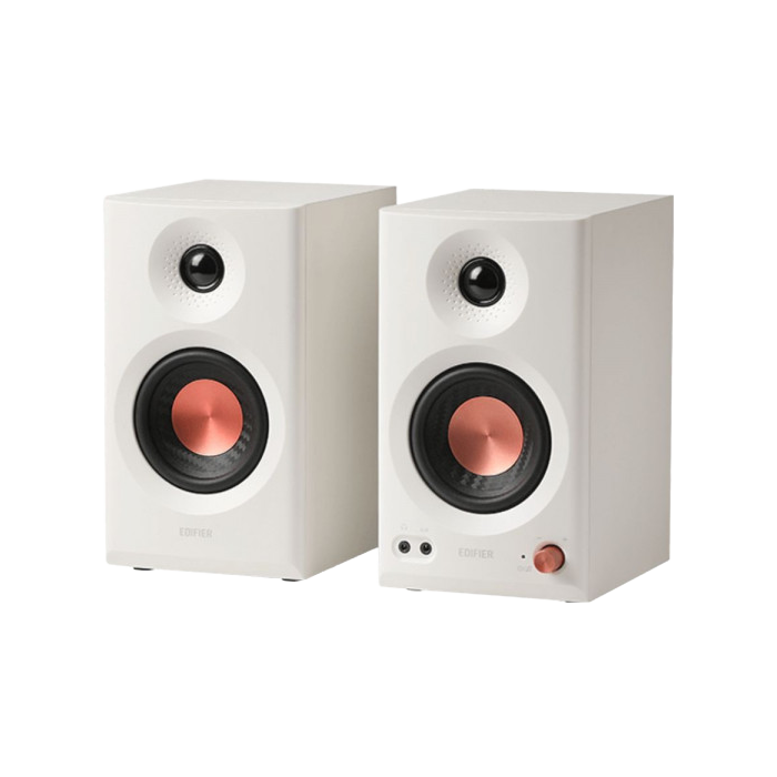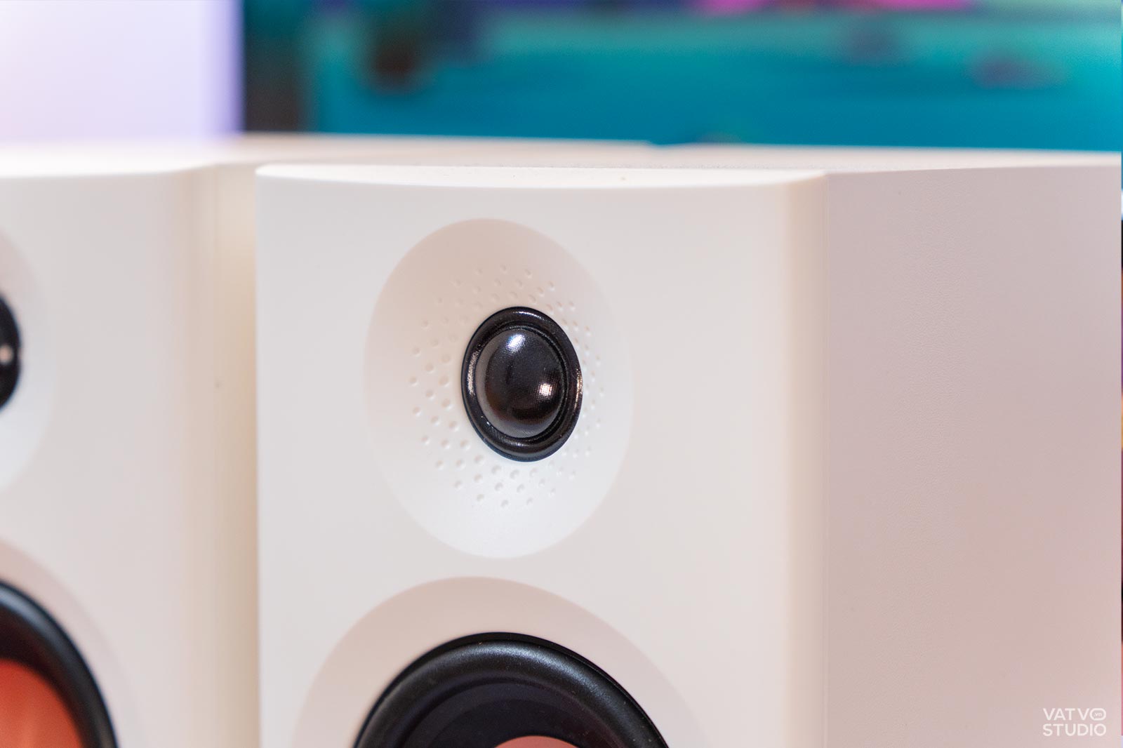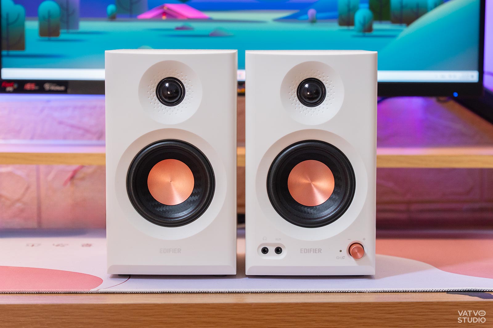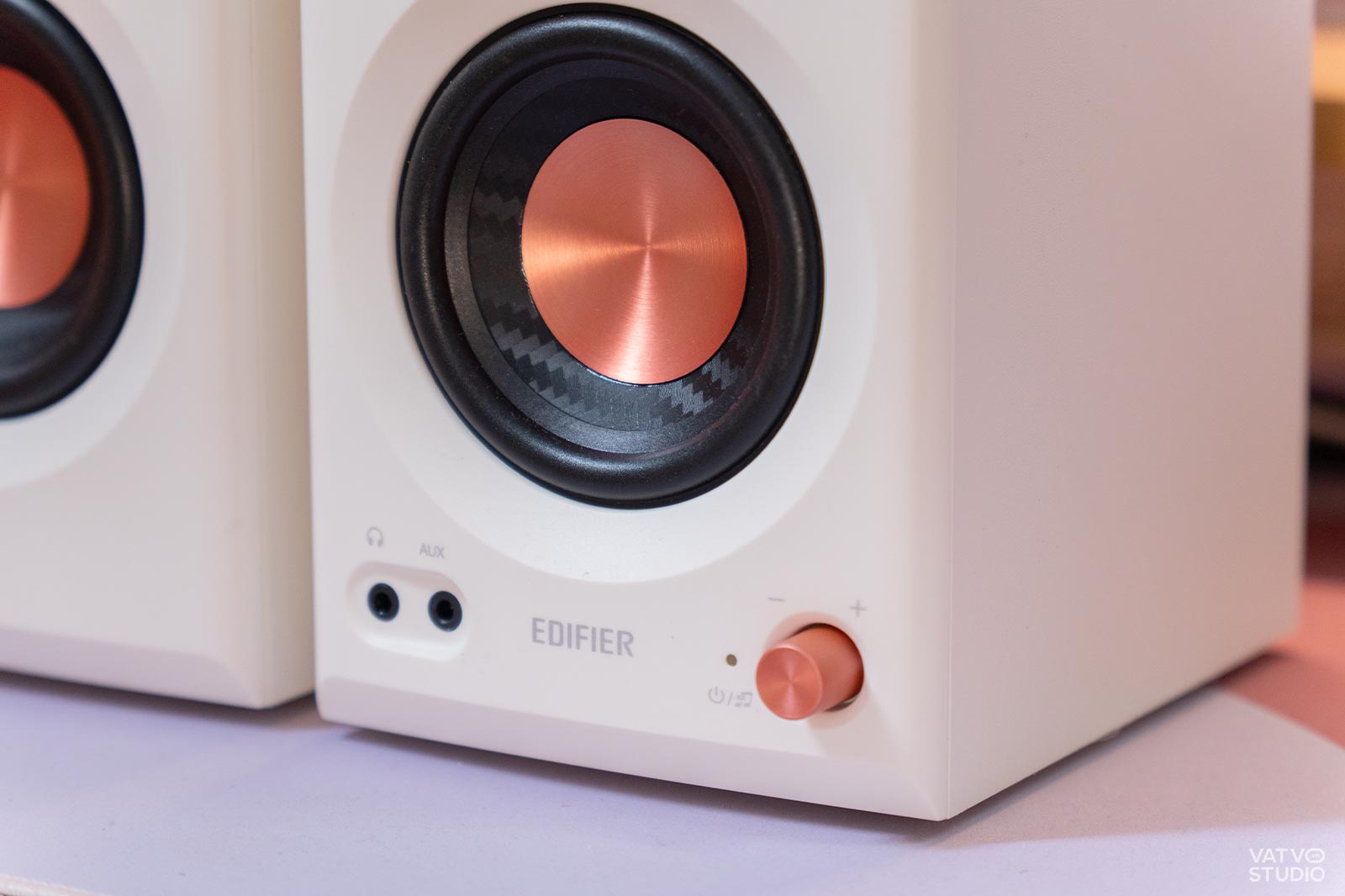 Điểm nhấn lớn nhất về ngoại hình nằm ở cách phối màu và hoàn thiện chi tiết. Trên phiên bản màu trắng, Edifier MR3 đã khéo léo lồng ghép các chi tiết màu vàng đồng (Rose Gold) vào màng loa Woofer và các núm xoay chức năng. Sự kết hợp này tạo nên vẻ ngoài sang trọng, cao cấp và bớt đơn điệu hơn hẳn so với tông màu đen trắng cơ bản thường thấy trên các dòng loa kiểm âm giá rẻ. Khu vực loa Treble cũng được thiết kế lại với phần ống dẫn sóng lõm sâu hơn, vừa tạo hiệu ứng thị giác ấn tượng, vừa hỗ trợ cải thiện khả năng tán âm.