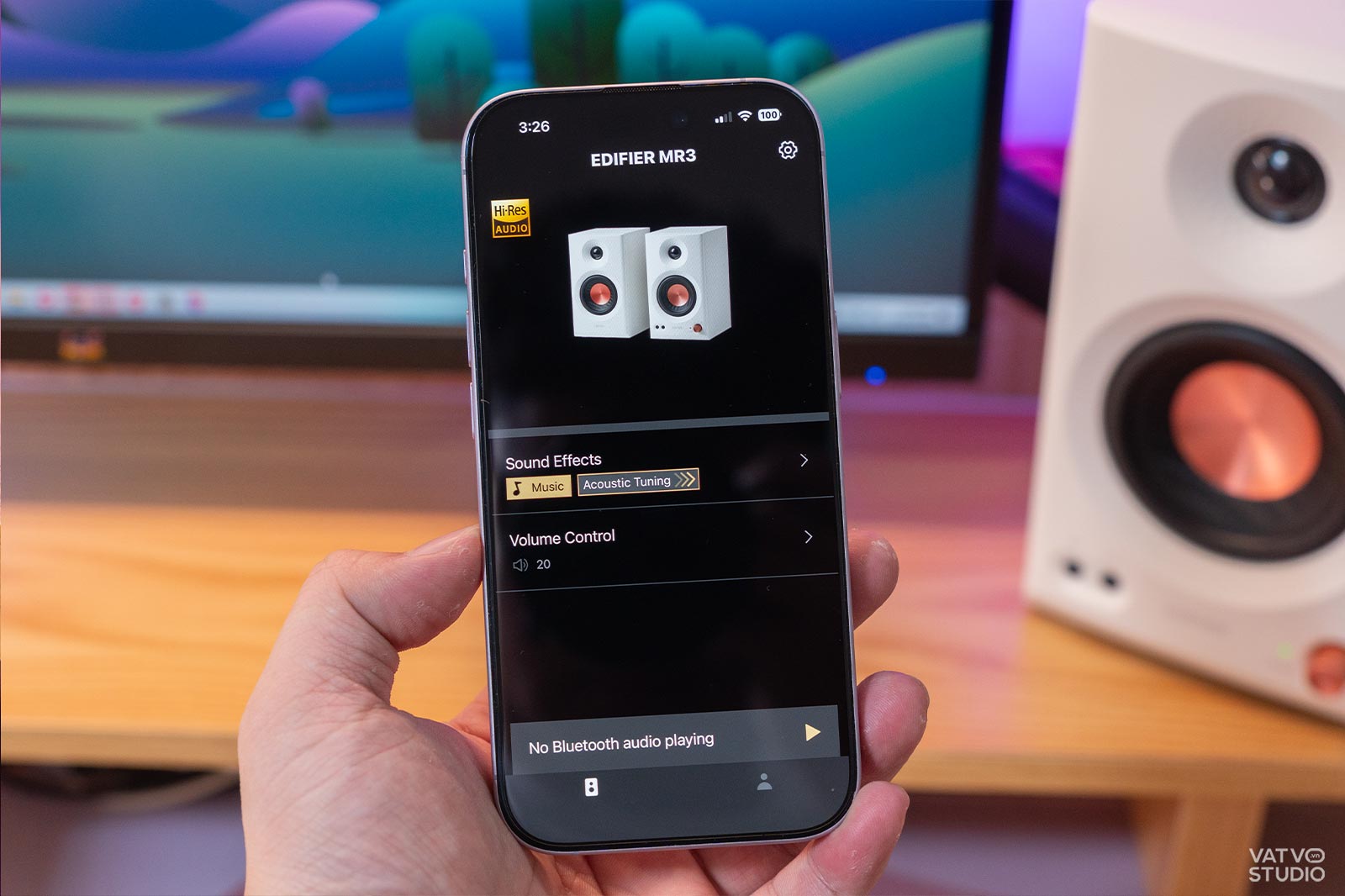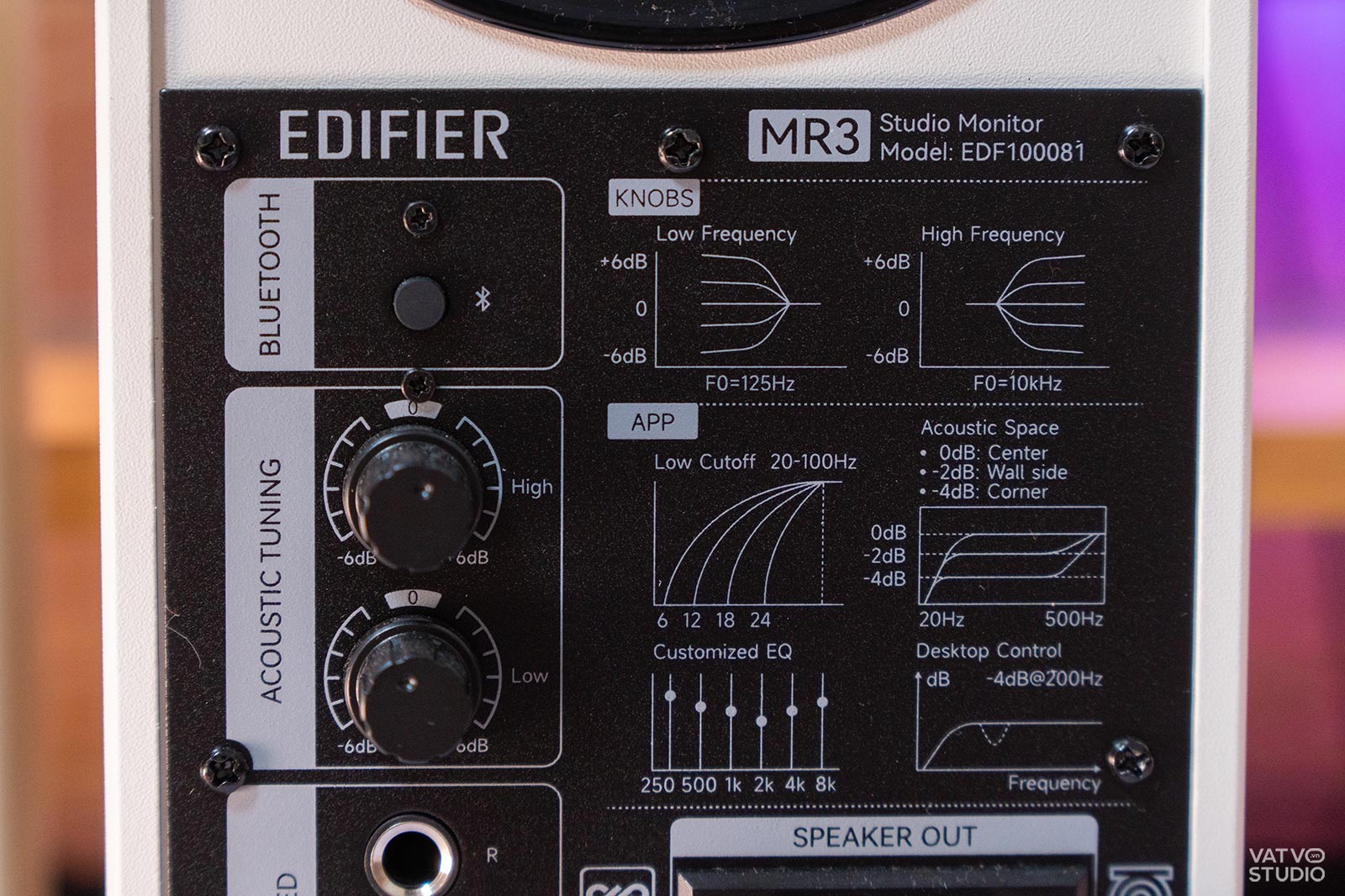 Hệ thống đèn LED thông báo trạng thái trên mặt trước Edifier MR3 cũng được quy hoạch rõ ràng tương ứng với các chế độ EQ. Cụ thể, đèn màu đỏ đại diện cho chế độ Monitor (Kiểm âm – âm thanh phẳng), đèn màu xanh lá cây là chế độ Music (Nghe nhạc – âm thanh sống động hơn), và đèn màu trắng xuất hiện khi người dùng sử dụng chế độ Custom EQ chỉnh qua ứng dụng. Nhờ đó, người dùng luôn biết chính xác loa đang hoạt động ở chế độ nào chỉ bằng một cái liếc mắt.